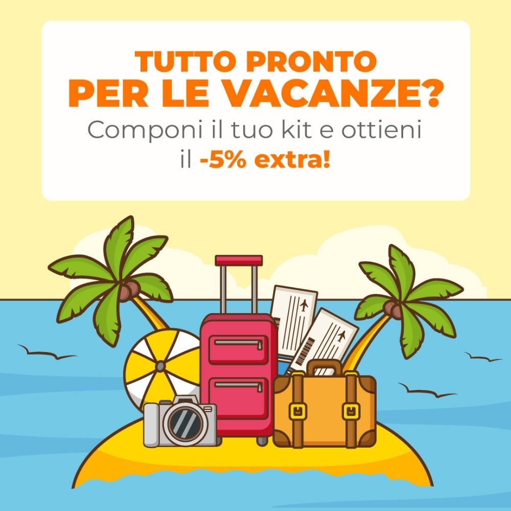 La promozione Kit Vacanze ti offre la possibilità di ricevere un extra-sconto del 5% sui prodotti aderenti all'iniziativa all'acquisto di almeno 1 prodotto di ognuna delle sezioni presenti in questa pagina.