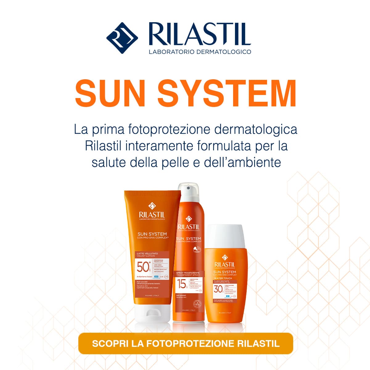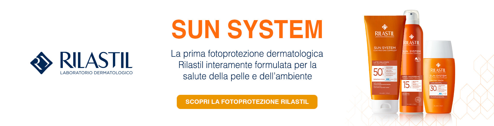 Rilastil - Sun System è la linea solare completa dalla protezione SPF15 alla SPF50, studiata per offrire una protezione adeguata a tutti i tipi di pelle, offrendo la sicurezza di una protezione dermatologica prima, durante e dopo l’esposizione solare e la gradevolezza di un cosmetico, disponibile in crema, fluido, spray trasparente e gel a seconda delle diverse esigenze.