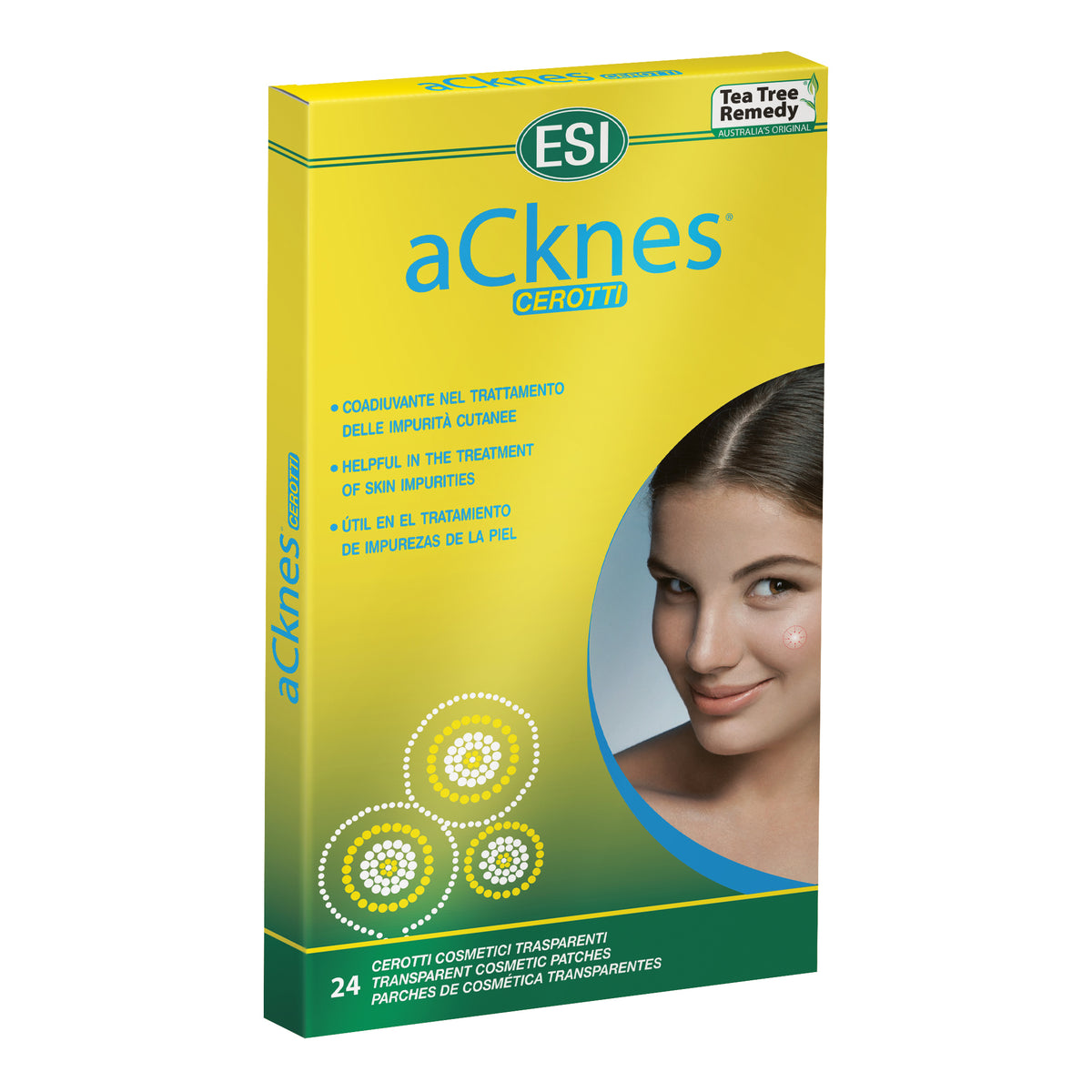 Innovativi mini cerotti adesivi pratici e facili da applicare direttamente sulla zona acneica del viso, ma anche del corpo. Sono trasparenti e quindi invisibili sulla pelle. Appositamente formulati per pelli impure. A base di Tea Tree Oil (con titolazione superiore al 38% in terpeni totali). L'olio essenziale estratto dalle foglie dell'albero del Tea Tree è un prodotto tipico dell'Australia ed è impiegato da secoli per le sue proprietà. Inoltre, contengono acido azelaico (purificante), zinco (normalizzante del sebo), aloe vera (idratante e nutriente) e le vitamine A, E, F (utili per il benessere della pelle). Acknes cerotti, grazie alla tecnologia a rilascio controllato, sono in grado di concentrare per 6-8 ore le sostanze naturali direttamente sull'area da trattare, aiutando così a combattere le irritazioni e gli arrossamenti, dando risultati visibili sin dalle prime applicazioni. Non contengono coloranti, profumi, parabeni e siliconi. Dermatologicamente testati.