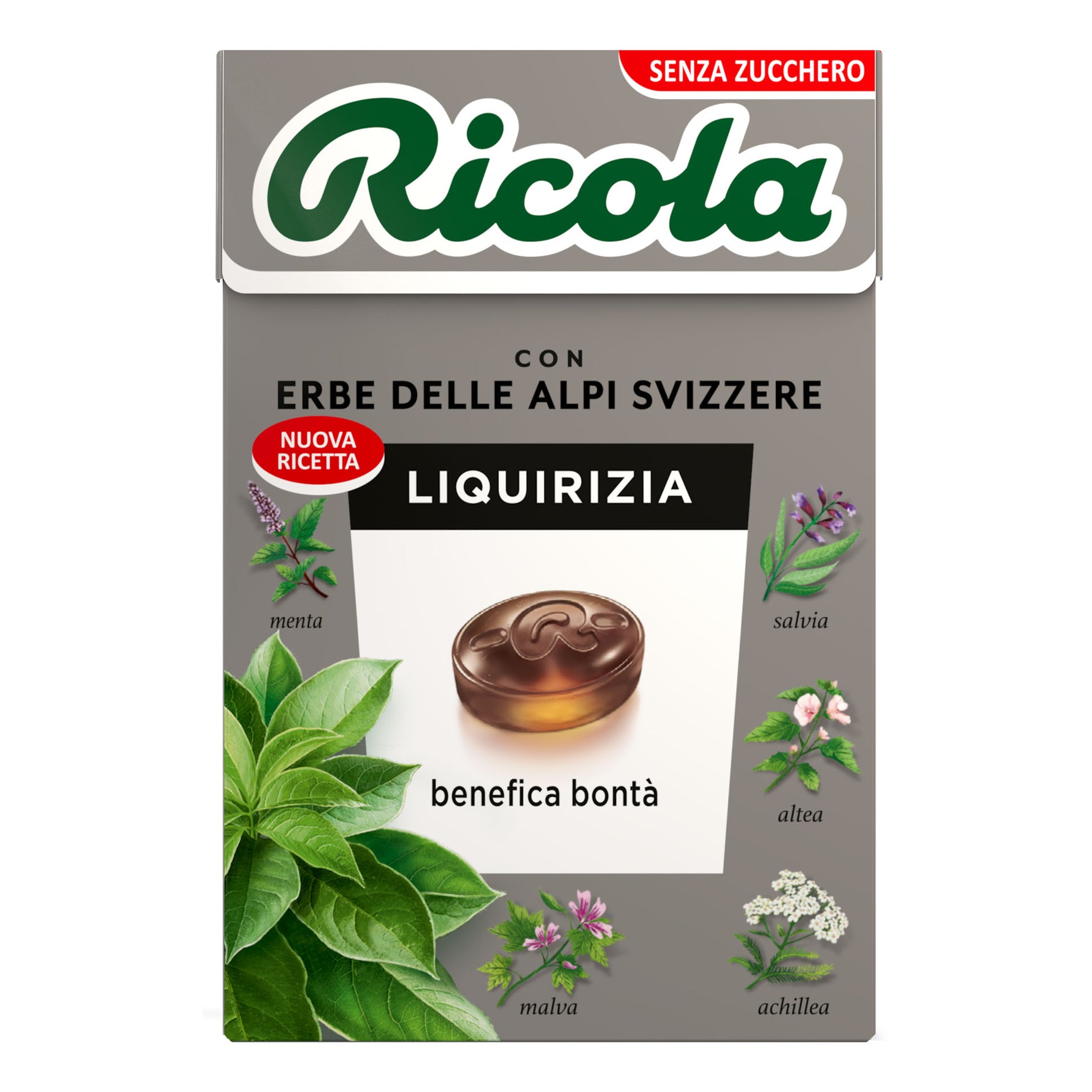 Isomalto; estratto (2,1%) di liquirizia; sorbitolo; eslratto (0,5%) della miscela di erbe Ricola; grassi vegetali idrogenati (cocco); cloruro di ammonio; colorante (caramello semplice); edulcorante (glicosidi steviolici); aroma naturale di anice stellato; emulsionante (lecitina di soia); mentolo; aroma naturale di menta.