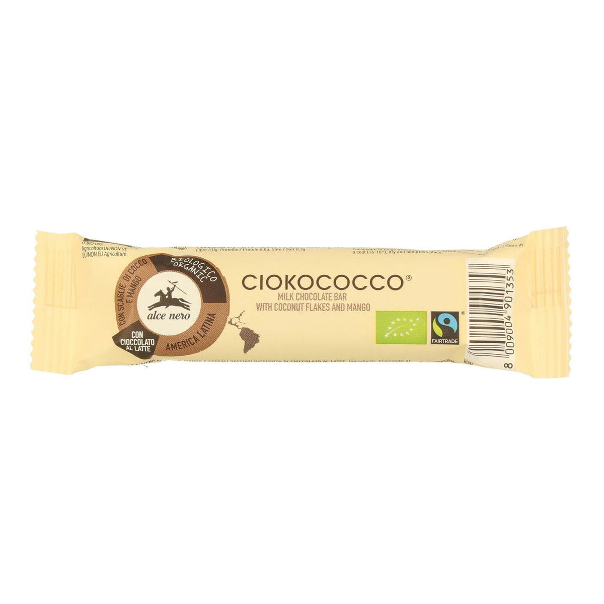 Cioccolato al latte* (30%) (zucchero di canna*°, burro di cacao*°, latte intero in polvere*, massa di cacao*°, latte scremato in polvere*, baccelli di vaniglia* °), zucchero di canna*°, latte intero in polvere*, scaglie di noce di cocco* (11%), olio di girasole*, burro di cacao*°, cereali soffiati* (5%) (riso*, zucchero di canna*, mais*, sale), mango essiccato*° (5%), grasso del latte*, baccelli di vaniglia*°.