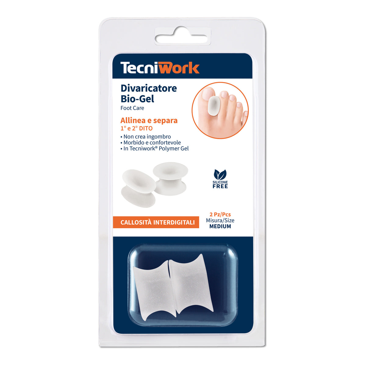 divaricatore in morbido Tecniwork Polymer Gel. Di forma anatomica, si adatta senza creare alcun ingombro all'interno della calzatura. L'olio minerale rilasciato dal Gel effettua un'azione emolliente sulla pelle e sulle callosità facilitandone la rimozione.