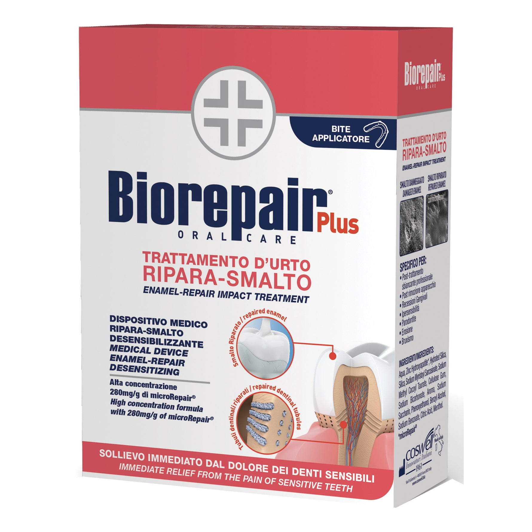 Dispositivo Medico CE. Trattamento desensibilizzante che ripara lo smalto dei denti grazie ai microRepair. Trattamento d'urto per colletti scoperti che fornisce sollievo immediato in caso di sensibilità dentinale. Può essere utilizzato in tutti i casi di sensibilità dentinale: grazie all'azione riparatrice dei microRepair, cristalli di idrossiapatite biomimetica in grado di legarsi allo smalto del dente, ripara lo smalto e crea una barriera naturale contro il dolore. È particolarmente indicato in caso di recessioni gengivali, parodontite, ipersensibilità e bruxismo; può essere inoltre utilizzato in seguito a sbiancamenti professionali o a rimozione di apparecchi ortodontici. Può essere applicato sulla superficie dei denti grazie al bite applicatore in dotazione in seguito alla propria igiene quotidiana; si consiglia l'uso del prodotto per cicli di 7/10 da ripetere una volta ogni 6 mesi o all'occorrenza.