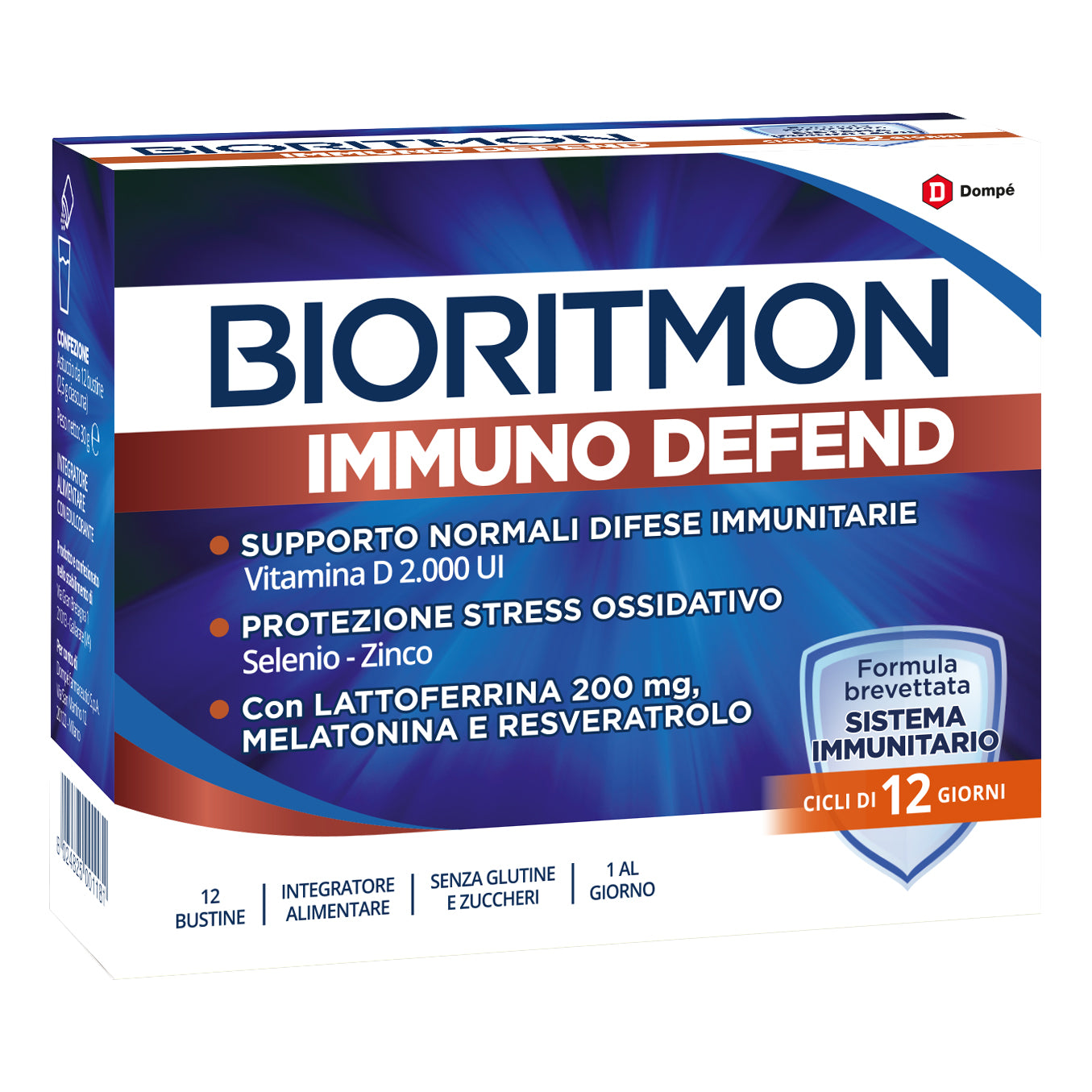 Il sistema immunitario ha lo scopo di difendere l'organismo dagli agenti aggressivi esterni. Bioritmon Immuno Defend, con Immuno Defend System, è un integratore alimentare a base di lattoferrina, resveratrolo, melatonina, vitamina D, selenio, zinco con edulcorante appositamente formulato per sostenere il sistema immunitario e aiutare a contrastare lo stress ossidativo. La vitamina D contribuisce a supportare il corretto funzionamento del sistema immunitario. Lo zinco e il selenio sono minerali essenziali per l'organismo. Fra le loro numerose funzioni ci sono anche quelle di contribuire alla normale funzione del sistema immunitario e di contribuire alla protezione delle cellule dallo stress ossidativo. La melatonina è una sostanza prodotta naturalmente dall'organismo e svolge un ruolo importante nella regolazione dei ritmi circadiani, tra cui il ritmo sonno-veglia. La lattoferrina è una proteina appartenente al gruppo delle glicoproteine coinvolta in varie funzioni; i mammiferi la assumono alla nascita attraverso il colostro e il latte materno ed è fisiologicamente presente in tutti i fluidi organici. Il resveratrolo è una sostanza vegetale antiossidante particolarmente abbondante nell'uva, nel gelso ed in alcune bacche.