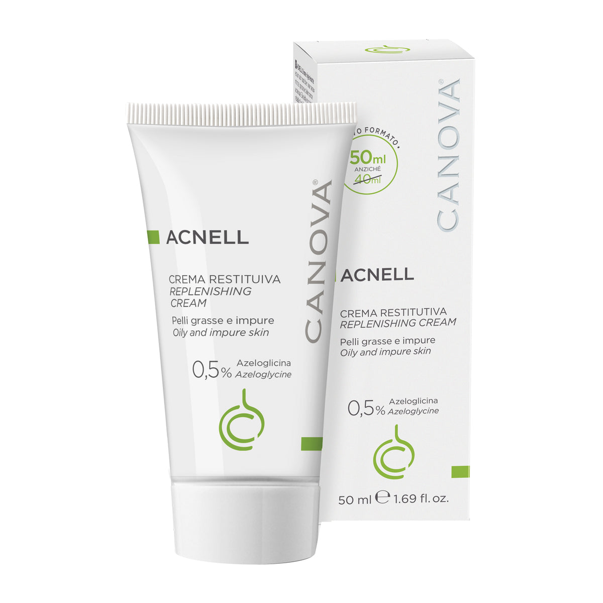 ACNELL crema restitutiva è l'ideale trattamento quotidiano per pelli miste, grasse e a tendenza acneica. Riduce la formazione di sebo, prevenendo le imperfezioni acneiche. Contiene un complesso purificante a base di estratti vegetali e Azeloglicina, un derivato dell’acido azelaico, che contribuisce a regolarizzare la produzione di sebo e idrata la pelle. Ha una texture leggera che si assorbe facilmente. Inoltre, la sua azione restitutiva, basata su ingredienti idratanti, la rende efficace nel riparare le pelli danneggiate da trattamenti farmacologici.