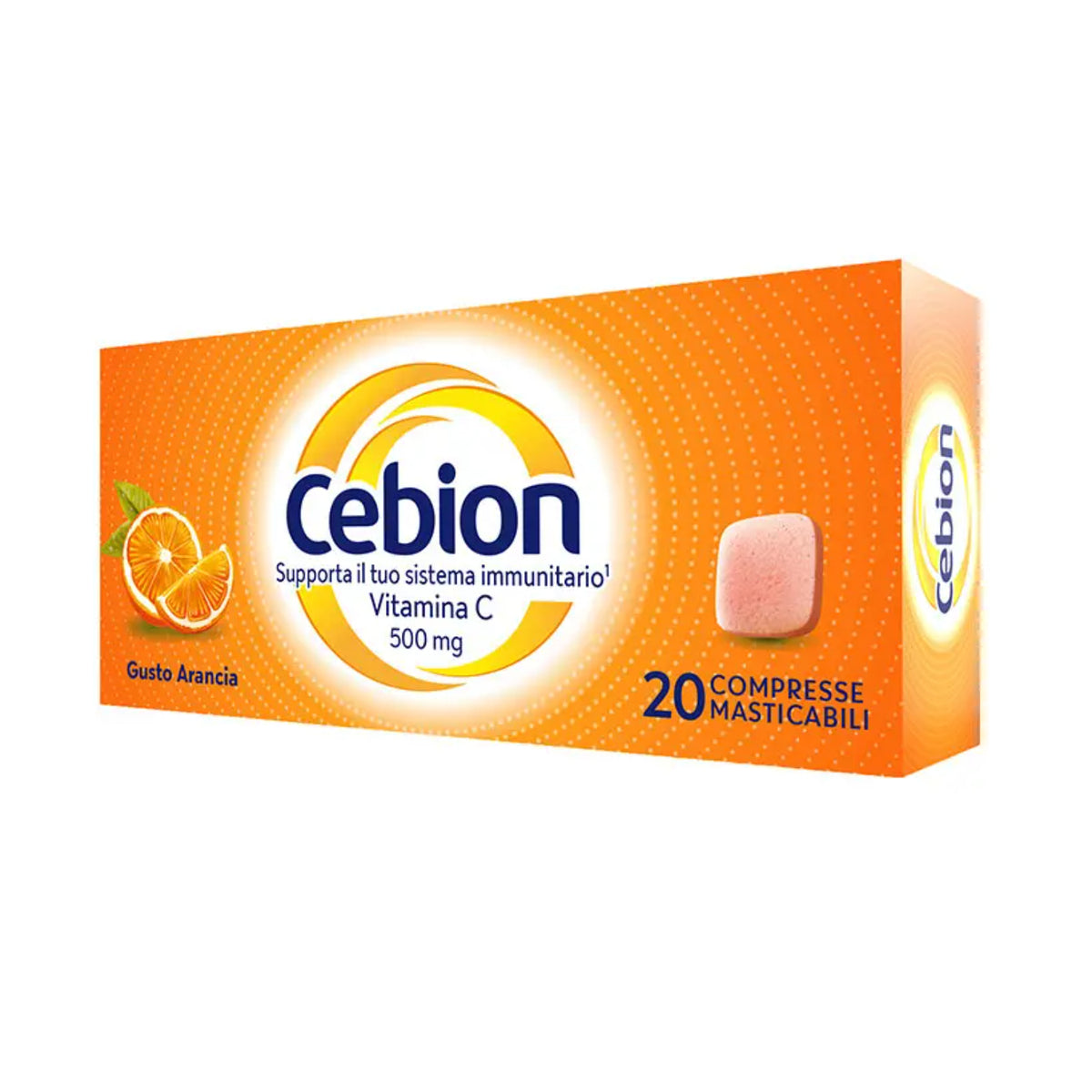 Cebion è un integratore alimentare di Vitamina C in compresse masticabili gusto arancia, formulato per contribuire al benessere del sistema immunitario e favorire l'assorbimento del ferro. Ogni compressa masticabile fornisce 500 mg di vitamina C, un nutriente essenziale per l'organismo.