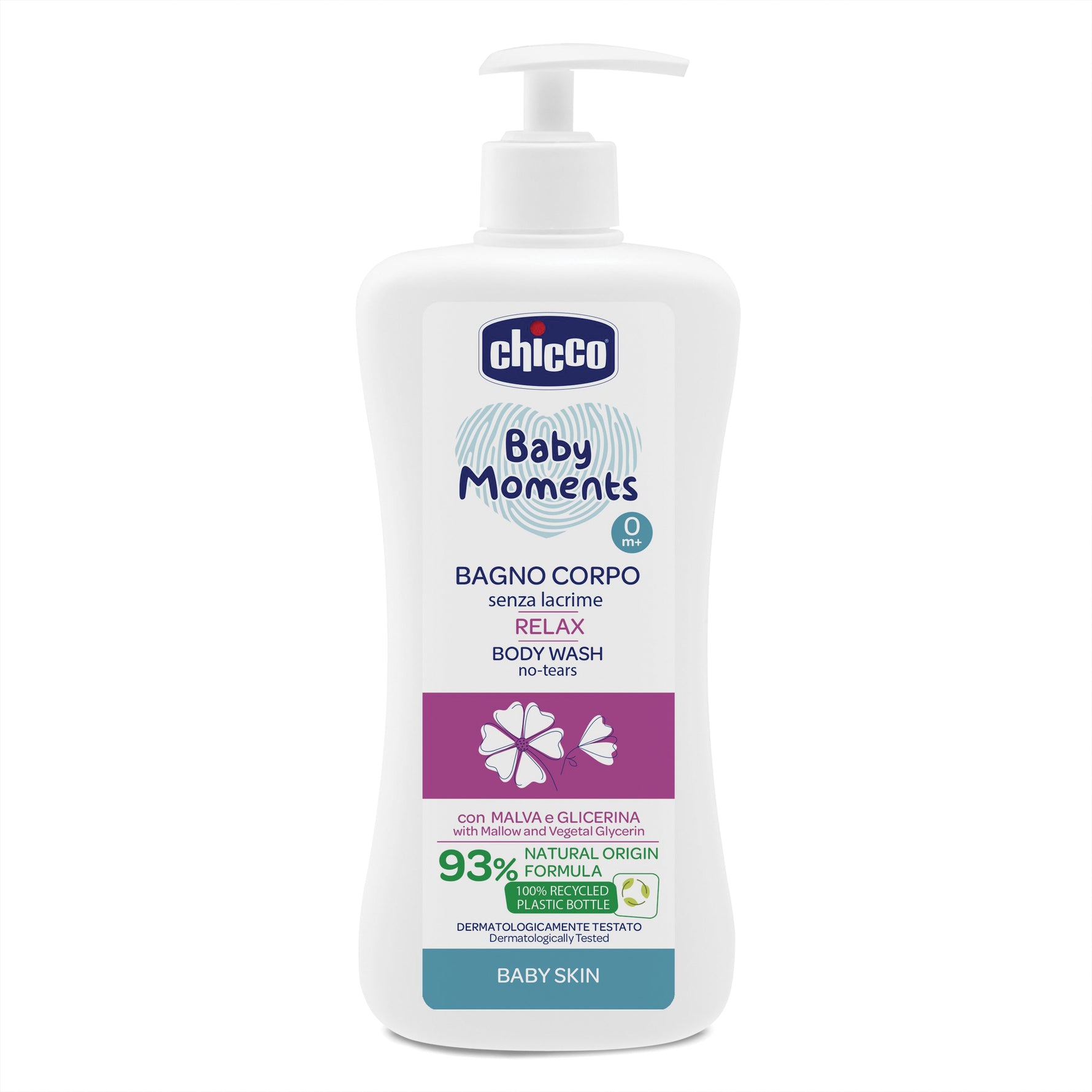 Bagno corpo relax. Formula 93% di origine naturale arricchita con estratto di malva, rilassante, e glicerina vegetale; rispetta l'equilibrio idrolipidico della pelle sottile dei neonati.