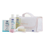 Un beauty case in morbido cotone piquet con maniglia e tasche interne racchiude il necessario per coccolare il piccolo durante e dopo il bagnetto.
