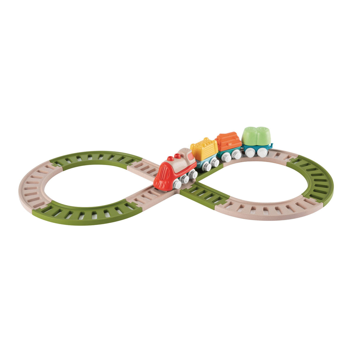 - Un ricco playset con trenino e binari da costruire a piacere e con cui divertirsi, per liberare la creativià e sviluppare capacità logiche… interamente realizzato in plasica riciclata!