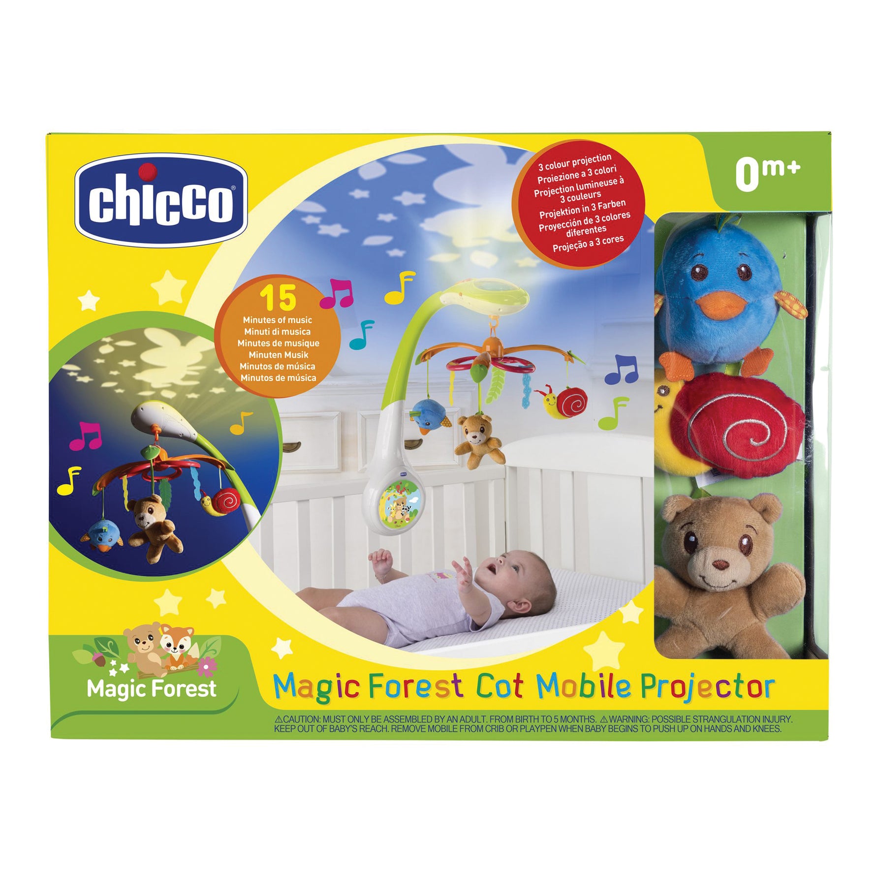 Con la giostrina a proiezione Chicco Foresta Magica potrai scegliere tra le tre funzioni disponibili, attivabili una alla volta, o selezionare la combinazione che preferisci.