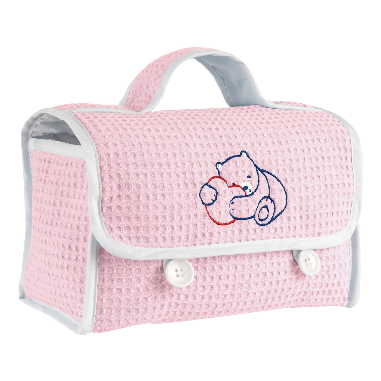 Prezioso beauty case in cotone disponibile in azzurro o rosa, realizzato in cotone all'esterno e con tessuto impermeabile all'interno.
