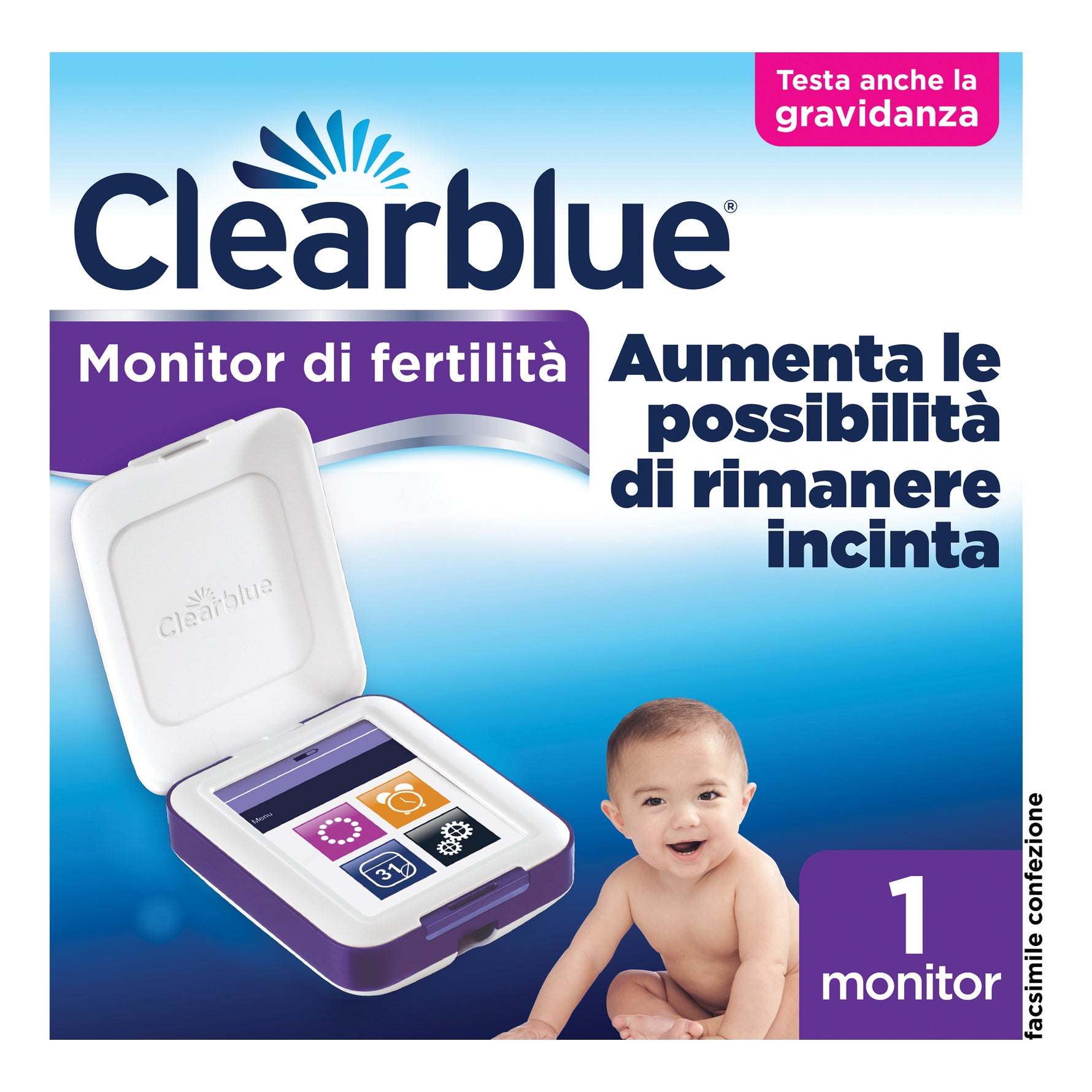 Il Clearblue Monitor di Fertilità Avanzato è un monitor che controlla e registra le informazioni su fertilità e gravidanza. Controlla i livelli di 2 ormoni chiave per la fertilità (estrogeno e ormone luteinizzante), identificando a ogni ciclo il tuo intervallo di fertilità, quando le probabilità di concepimento sono più elevate (i pochi giorni precedenti e corrispondenti all'ovulazione). Ti permette anche di verificare se sei riuscita a rimanere incinta.