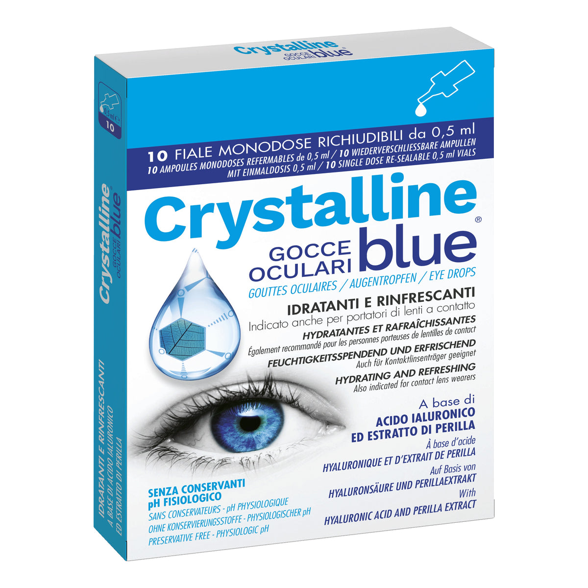 DESCRIZIONE: Dispositivo medico CE. Gocce oculari ad uso oftalmico, costituito da una soluzione sterile, ad alta biocompatibilità, a pH fisiologico e priva di conservanti. Contiene un estratto di perilla e acido ialuronico. Per la sua composizione, la formula CRYSTALLINE BLUE è indicato per alleviare l'arrossamento, la secchezza e l'affaticamento oculare causati da agenti atmosferici, ambientali (polveri, allergeni) e da stress visivi (prolungato uso del computer e utilizzo di lenti a contatto, eccessiva esposizione alla luce). È consigliabile anche per un uso frequente e prolungato. L'instillazione prima di indossare le lenti a contatto ne facilita l'applicazione mentre dopo ne rende più confortevole l'utilizzo.