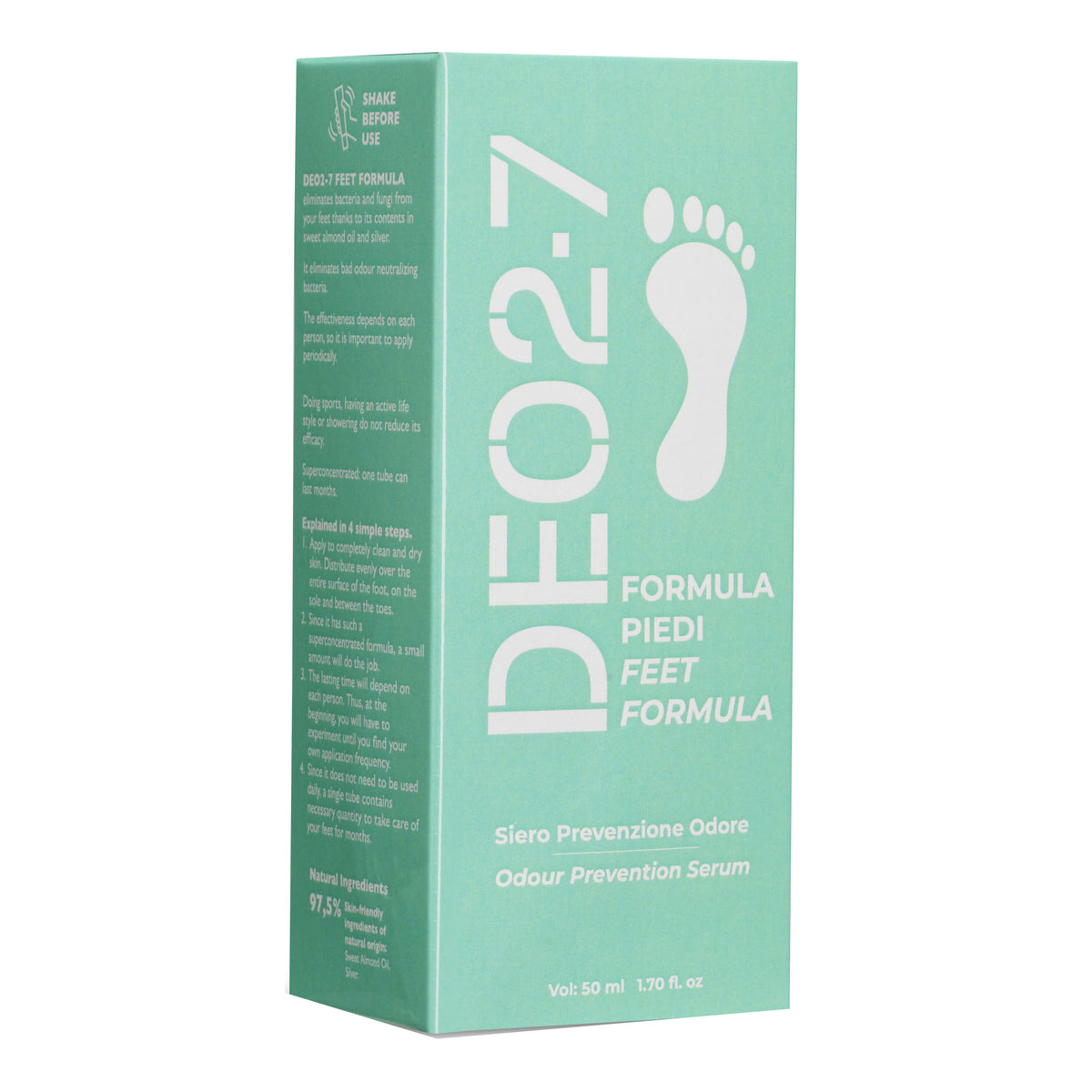 DescrizioneFormula piedi che elimina batteri e funghi dai piedi grazie al suo contenuto in olio di mandorle dolci e argento.