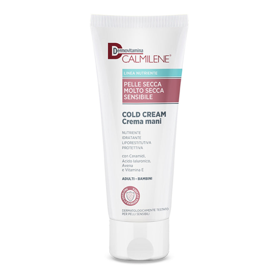 Crema mani nutriente ed idratante. Aiuta a prevenire i danni alla pelle delle mani causati da agenti esterni e a ripristinare la barriera protettiva della pelle. Dona sollievo alle mani secche e screpolate. Dermovitamina Calmilene Cold Cream Crema Mani contiene un complesso di ceramidi che agiscono sinergicamente imitando la struttura lipidica dello strato esterno della pelle, per una maggiore idratazione e protezione ripristinando la barriera cutanea. L'acido Ialuronico assorbe e trattiene l'acqua sulla superficie cutanea, svolgendo un’azione che contrasta la disidratazione e proteggendo la pelle grazie alla sua azione filmante. Il complesso lipidico di avena ripara e rinnova la barriera lipidica della pelle. Infine la vitamina E allevia e ammorbidisce la cute secca e ruvida.