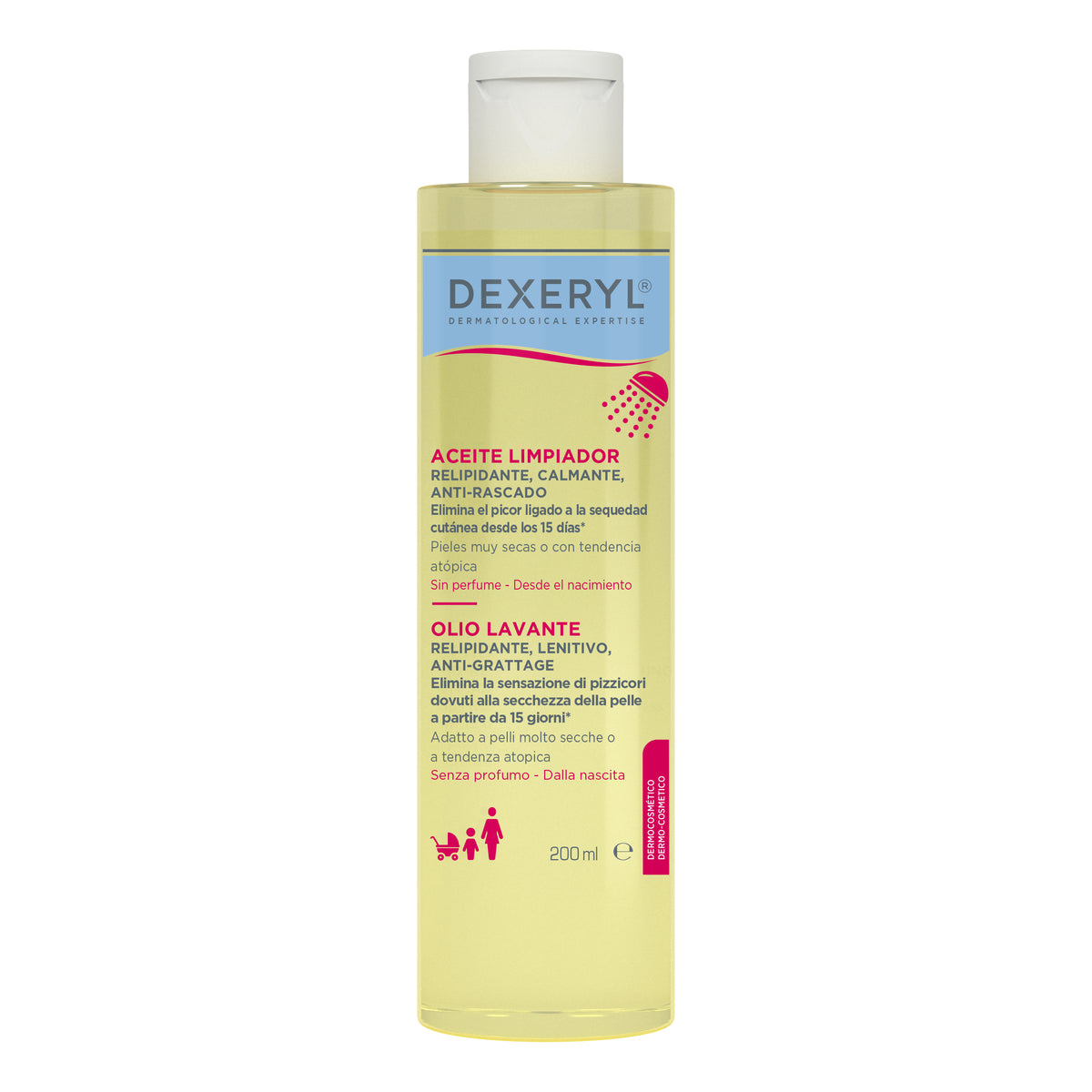 DEXERYL Cleansing Oil è un prodotto per l'igiene dermatologica che deterge e protegge la pelle secca e a tendenza atopica, per tutta la famiglia, dai neonati ai bambini più grandi, per il viso o il corpo.