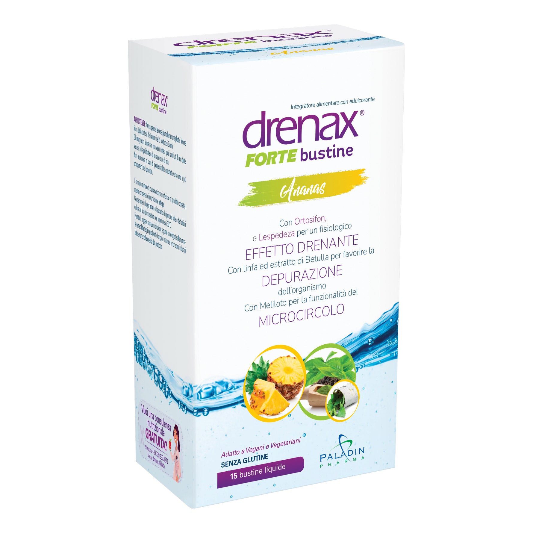 Linfa di betulla, ortosifon, betulla, tè verde, carciofo, cardo mariano, Centella asiatica, ribes nero, Lespedeza capitata, meliloto, uva rossa, rutina, ananas.