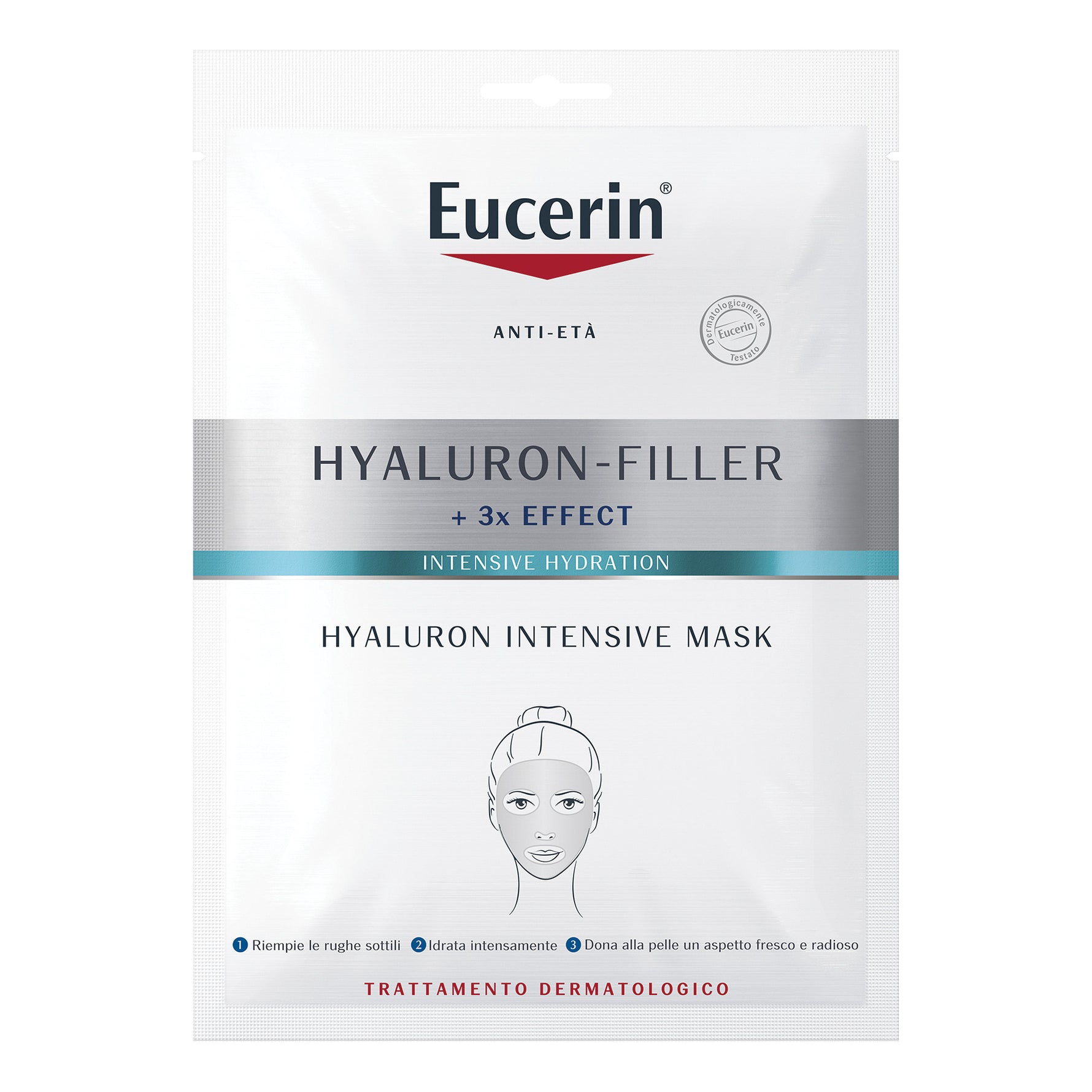 Hyaluron Intensive Mask contiene la combinazione di Acido Ialuronico a basso e alto peso molecolare di Eucerin. L'Acido Ialuronico ad alto peso molecolare migliora l'idratazione e leviga le linee sottili degli strati più esterni della pelle, mentre l'Acido Ialuronico a basso peso molecolare, che è 40 volte più piccolo*, penetra ulteriormente negli strati dell'epidermide più profondi apportando acqua.