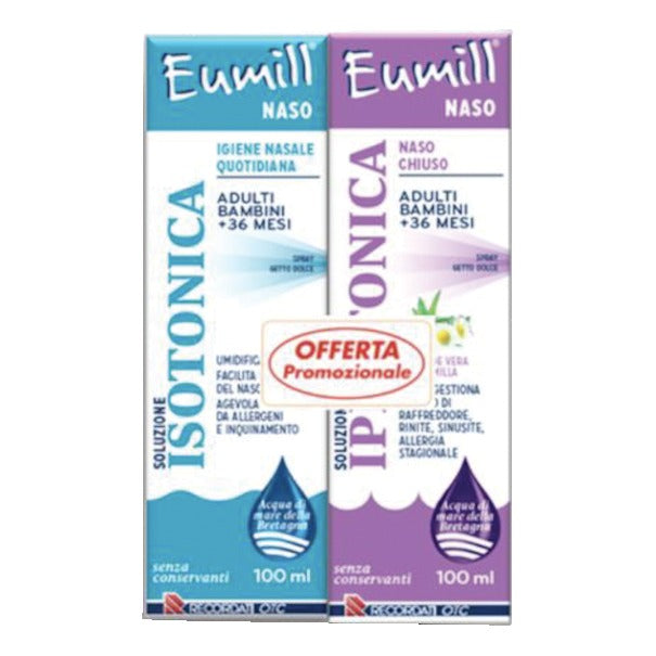 Eumill naso soluzione ipertonica* decongestiona le cavità nasali in caso di naso chiuso dovuto a raffreddore, sinusite, rinite, rinite allergica e rinite cronica. L'acqua di mare ipertonica ha un'azione decongestionante immediata e agevola l'eliminazione del muco, delle impurità e egli agenti patogeni. È efficace anche nella prevenzione e come coadiuvante di riniti, riniti allergiche, riniti croniche e sinusiti o dopo interventi chirurgici alle cavità nasali. Eumill naso soluzione ipertonica, acqua di mare 100% naturale, contiene Sali minerali e oligoelementi marini (quali rame, manganese, iodio, zinco, ecc.), che proteggono la mucosa nasale. Unisce i benefici dell'acqua di mare all'effetto decongestionante di una soluzione ipertonica, senza aggredire le mucose nasali.