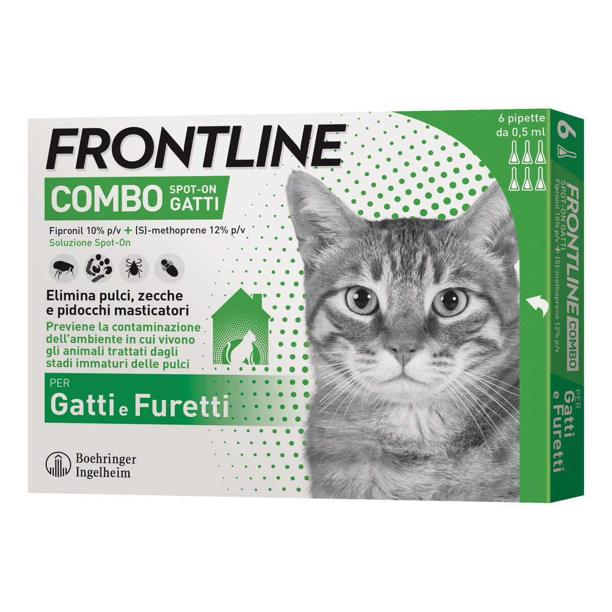 Nei gatti: da utilizzare nei confronti delle infestazioni da pulci, dasole o associate a zecche e pidocchi masticatori. Elimina le pulci (Ctenocephalides spp.). L'attivita' insetticida nei confronti di nuove infestazioni da pulci adulte persiste per 4 settimane. Previene la moltiplicazione delle pulci inibendo lo sviluppo delle uova (attivita' ovicida), delle pupe e delle larve (attivita' larvicida) nate dalle uovadeposte dalle pulci adulte, per 6 settimane dopo l'applicazione. Elimina le zecche (Ixodes ricinus, Dermacentor variabilis, Rhipicephalus sanguineus). Il prodotto ha un'attivita' nei confronti delle zecche persistente fino a 2 settimane (in base a dati sperimentali). Elimina i pidocchi masticatori (Felicola subrostratus). Frontline Combo Spot-on Gatti puo' essere utilizzato nel programma per il controllo della Dermatite Allergica da Pulce (DAP). Nei furetti: da utilizzare nei confrontidelle infestazioni da pulci, da sole o associate a zecche. Elimina lepulci (Ctenocephalides spp.). L'attivita' insetticida nei confronti di nuove infestazioni da pulci adulte persiste per 4 settimane. Previene la moltiplicazione delle pulci inibendo lo sviluppo delle uova (attivita' ovicida), delle pupe e delle larve (attivita' larvicida) nate dalle uova deposte dalle pulci adulte. Elimina le zecche (Ixodes ricinus). Il prodotto ha un'attivita' acaricida nei confronti delle zecche persistente per 4 settimane (in base a dati sperimentali).