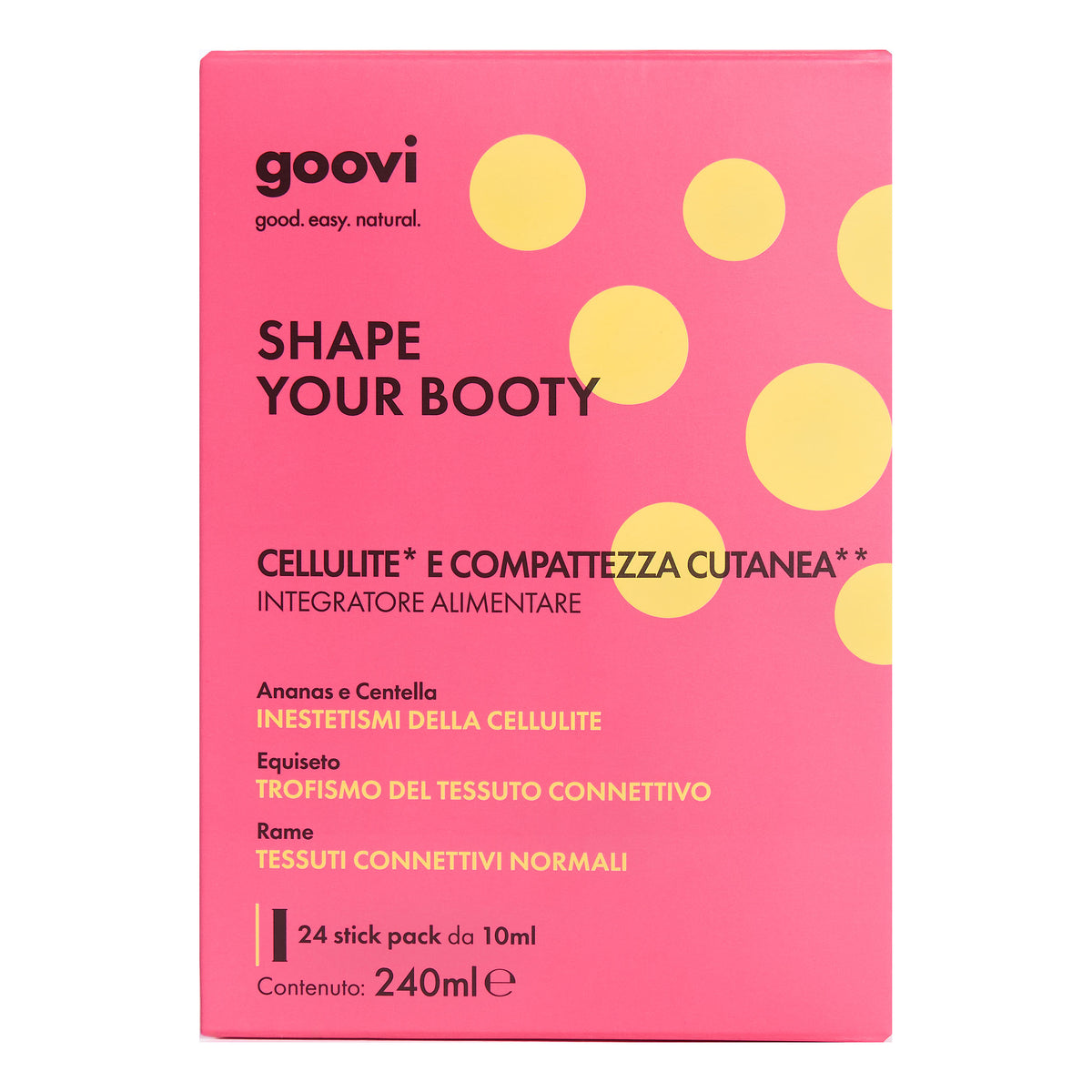 Goovi Shape Your Booty è un integratore alimentare formulato per contrastare gli inestetismi della cellulite e favorire il drenaggio dei liquidi corporei. La sua composizione unisce succhi concentrati naturali e fitocomplessi attivi che agiscono in sinergia per migliorare la qualità del tessuto connettivo e la funzionalità del microcircolo.