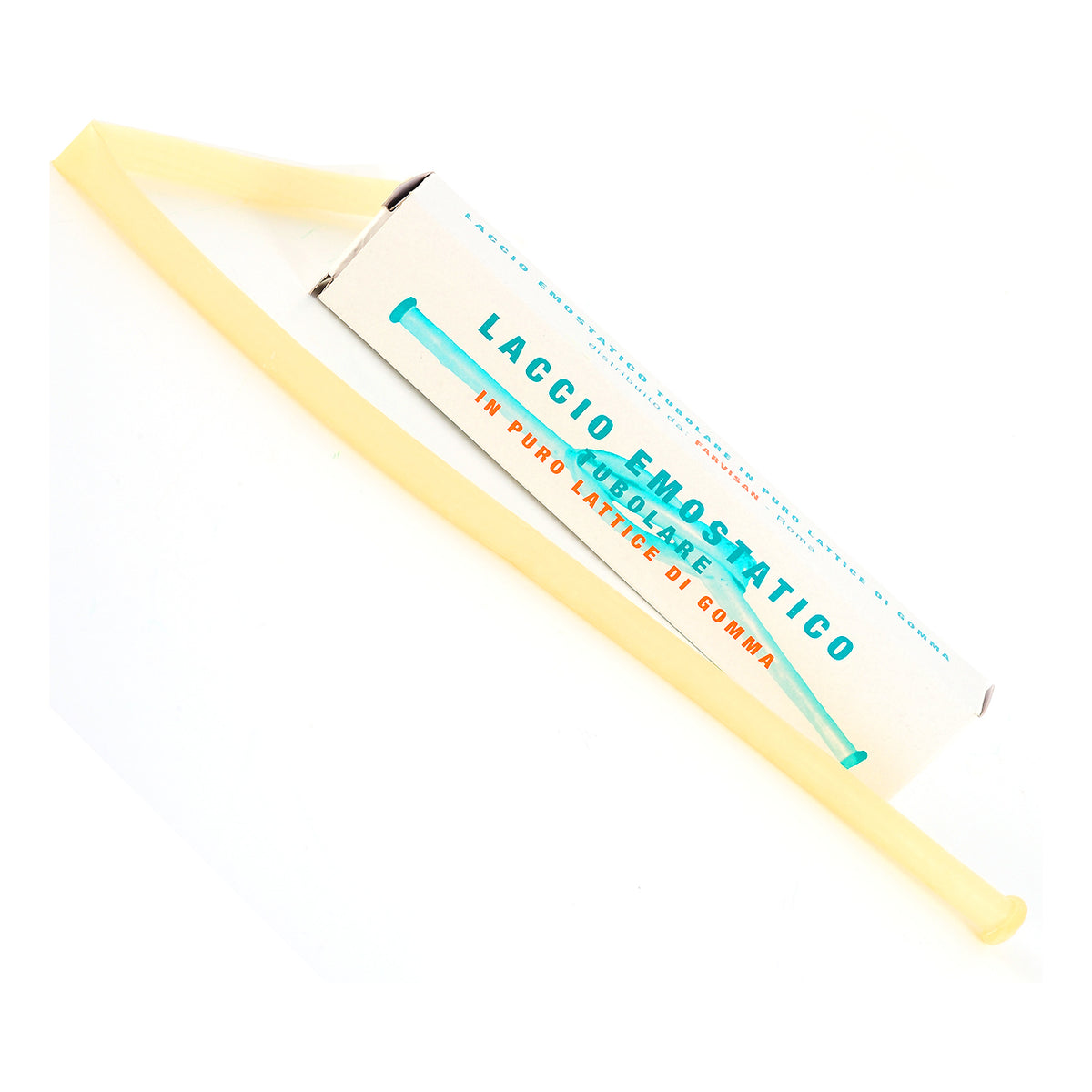 Lacci emostatici tubolari in lattice di gomma naturale, con bordino, atossici. I lacci emostatici in puro lattice di gomma vengono utilizzati come barriera meccanica per la compressione dei vasi sanguigni durante prelievi venosi o come barriera meccanica a monte delle ferite per fermare l'emorragia.