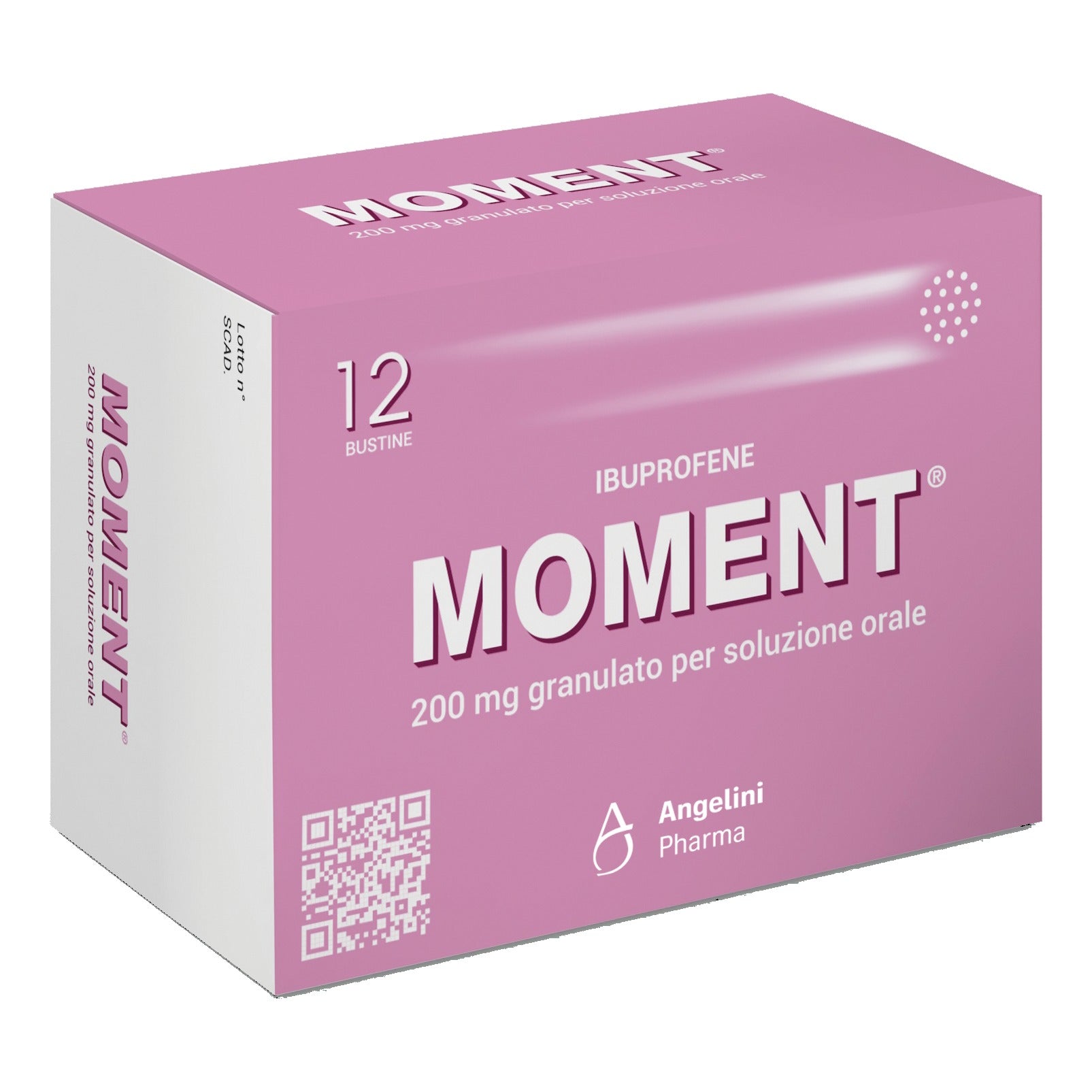 • In pazienti asmatici il prodotto deve essere utilizzato con cautela, dopo aver consultato il medico. • Dovrebbero usare cautela quei pazienti la cui attività richiede vigilanza nel caso essi notassero sonnolenza, vertigine o depressione durante la terapia con ibuprofene. • L’uso di Moment, come di qualsiasi farmaco inibitore della sintesi delle prostaglandine e della cicloossigenasi e’ sconsigliato nelle donne che intendano iniziare una gravidanza. • La somministrazione di Moment dovrebbe essere sospesa nelle donne che hanno problemi di fertilità o che sono sottoposte a indagini sulla fertilità. • L’uso di Moment deve essere evitato in concomitanza di FANS, inclusi gli inibitori selettivi della COX–2. • Gli effetti indesiderati possono essere minimizzati con l’uso della più bassa dose efficace per la più breve durata possibile di trattamento che occorre per controllare i sintomi (vedere i paragrafi sottostanti sui rischi gastrointestinali e cardiovascolari). • Effetti cardiovascolari e cerebrovascolari: studi clinici e dati epidemiologici suggeriscono che l’uso di ibuprofene, specialmente ad alti dosaggi (2400 mg/die) e per trattamenti di lunga durata, può essere associato ad un modesto aumento del rischio di eventi trombotici arteriosi (p.es. infarto del miocardio o ictus). In generale, gli studi epidemiologici non suggeriscono che basse dosi di ibuprofene (per es. ≤ 1200 mg/die) siano associate ad un aumento del rischio di infarto del miocardio. • Negli adolescenti disidratati esiste il rischio di alterazione della funzionalità renale. • Anziani: i pazienti anziani hanno un aumento della frequenza di reazioni avverse ai FANS, specialmente emorragie e perforazioni gastrointestinali, che possono essere fatali (vedi sezione 4.2). • Emorragia gastrointestinale, ulcerazione e perforazione: durante il trattamento con tutti i FANS, in qualsiasi momento, con o senza sintomi di preavviso o precedente storia di gravi eventi gastrointestinali, sono state riportate emorragia gastrointestinale, ulcerazione e perforazione, che possono essere fatali. • Negli anziani e in pazienti con storia di ulcera, soprattutto se complicata da emorragia o perforazione (vedi sezione 4.3), il rischio di emorragia gastrointestinale, ulcerazione o perforazione e’ più alto con dosi aumentate di FANS. Questi pazienti devono iniziare il trattamento con la più bassa dose disponibile. L’uso concomitante di agenti protettori (misoprostolo o inibitori di pompa protonica) deve essere considerato per questi pazienti e anche per pazienti che assumono basse dosi di aspirina o altri farmaci che possono aumentare il rischio di eventi gastrointestinali (vedi sotto e sezione 4.5).• Pazienti con storia di tossicità gastrointestinale, in particolare anziani, devono riferire qualsiasi sintomo gastrointestinale inusuale (soprattutto emorragia gastrointestinale) in particolare nelle fasi iniziali del trattamento. • Controllare attentamente i pazienti che assumono farmaci concomitanti che potrebbero aumentare il rischio di ulcerazione o emorragia, come corticosteroidi orali, anticoagulanti come warfarin, inibitori selettivi del reuptake della serotonina o agenti antiaggreganti come l’aspirina (vedi sezione 4.5). • Quando si verifica emorragia o ulcerazione gastrointestinale in pazienti che assumono Moment il trattamento deve essere sospeso. • I FANS devono essere somministrati con cautela nei pazienti con una storia di malattia gastrointestinale (colite ulcerosa, morbo di Crohn) poiché tali condizioni possono essere esacerbate (vedi sezione 4.8). • Cautela è richiesta prima di iniziare il trattamento nei pazienti con anamnesi positiva per ipertensione e/o insufficienza cardiaca poiché in associazione al trattamento con i FANS sono stati riscontrati ritenzione di liquidi, ipertensione ed edema. • Gravi reazioni cutanee alcune delle quali fatali, includenti dermatite esfoliativa, sindrome di Stevens–Johnson e necrolisi tossica epidermica, sono state riportate molto raramente in associazione con l’uso dei FANS (vedi 4.8). Nelle prime fasi della terapia i pazienti sembrano essere a più alto rischio: l’insorgenza della reazione si verifica nella maggior parte dei casi entro il primo mese di trattamento. Moment deve essere interrotto alla prima comparsa di rash cutaneo, lesioni della mucosa o qualsiasi altro segno di ipersensibilità. • Moment 200 mg granulato per soluzione orale contiene: – 2,25 Mmoli di potassio per bustina. Da tenere in considerazione in persone con ridotta funzionalità renale o che seguono una dieta a basso contenuto di potassio. – aspartame, una fonte di fenilanina, perciò e’ controindicato nei soggetti affetti da fenilchetonuria. – saccarosio: pazienti con problemi di rara malattia ereditaria al fruttosio, malassorbimento di glucosio e galattosio, o da insufficienza di sucrasi isomaltasi, non devono assumere questo medicinale.