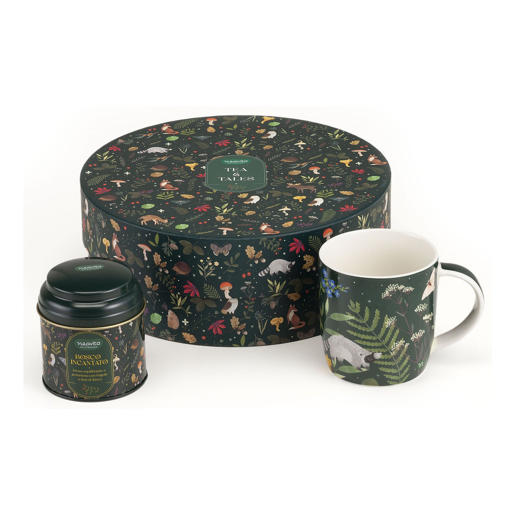 DescrizioneCofanetto con tazza in ceramica e barattolino con filtroscrigno Bosco Incantato.