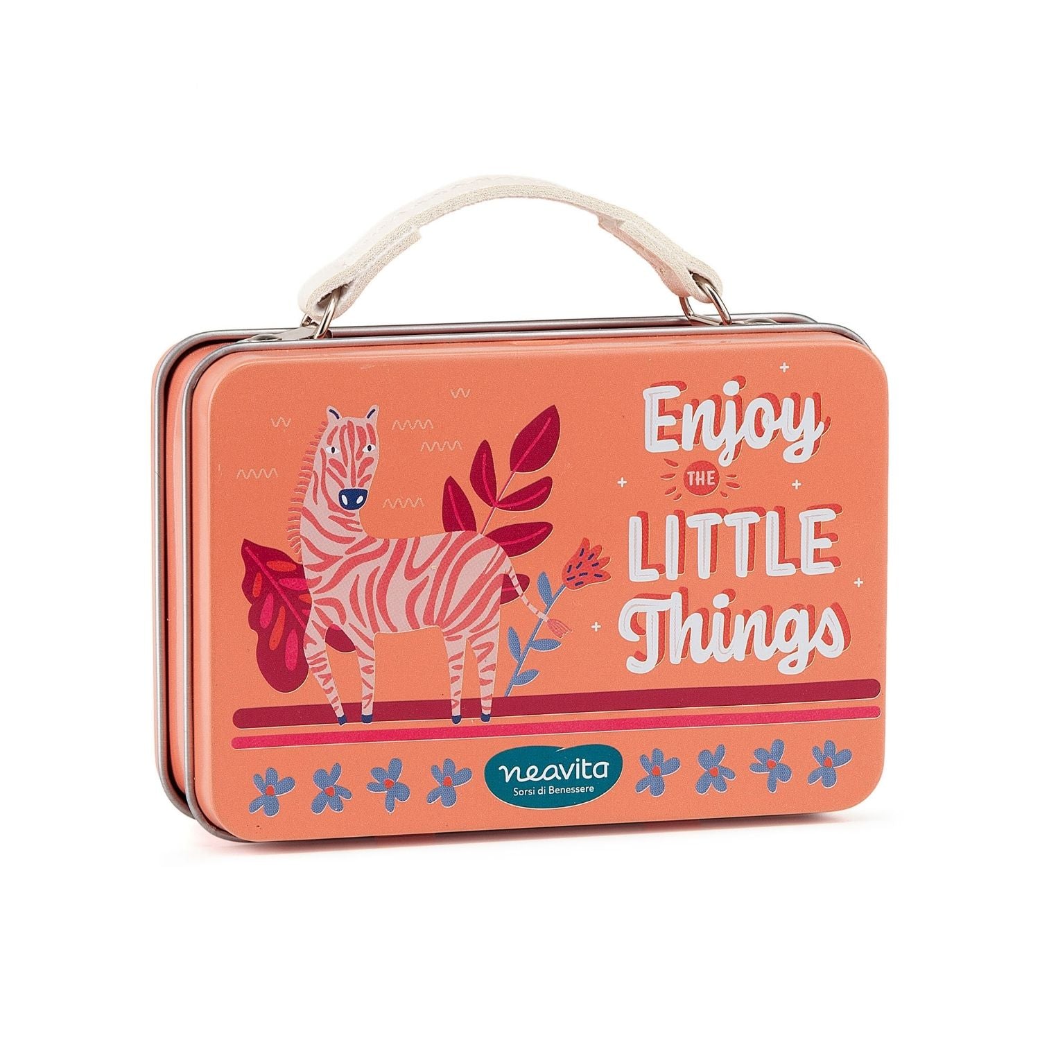 Neavita Pensieri Belli è una collezione che celebra la cura di sé attraverso piccoli gesti quotidiani. Questa valigetta arancione decorata con la zebra e la scritta Enjoy the Little Things è un invito a godere delle piccole cose della vita. L'infuso Gioia di Vita racchiuso al suo interno è una vera melodia di sapori che avvolge e coccola, perfetto per chi cerca momenti di vitalità e buonumore. La confezione in latta di qualità è un vero oggetto da collezione, riutilizzabile all'infinito e perfetto come idea regalo originale.