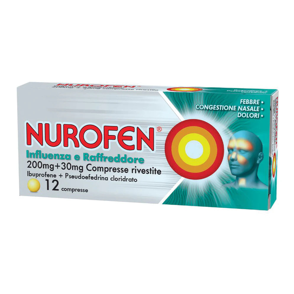 Nurofen Influenza e Raffreddore compresse rivestite è un farmaco da banco (OTC) che combina due principi attivi: ibuprofene 200mg (FANS con azione analgesica, antinfiammatoria e antipiretica) e pseudoefedrina cloridrato 30mg (decongestionante nasale). Questa combinazione agisce simultaneamente su febbre, dolori muscolari, mal di testa e congestione nasale tipici degli stati influenzali e da raffreddamento. Indicato per adulti e adolescenti oltre i 15 anni. Conforme alle normative AIFA per farmaci OTC.