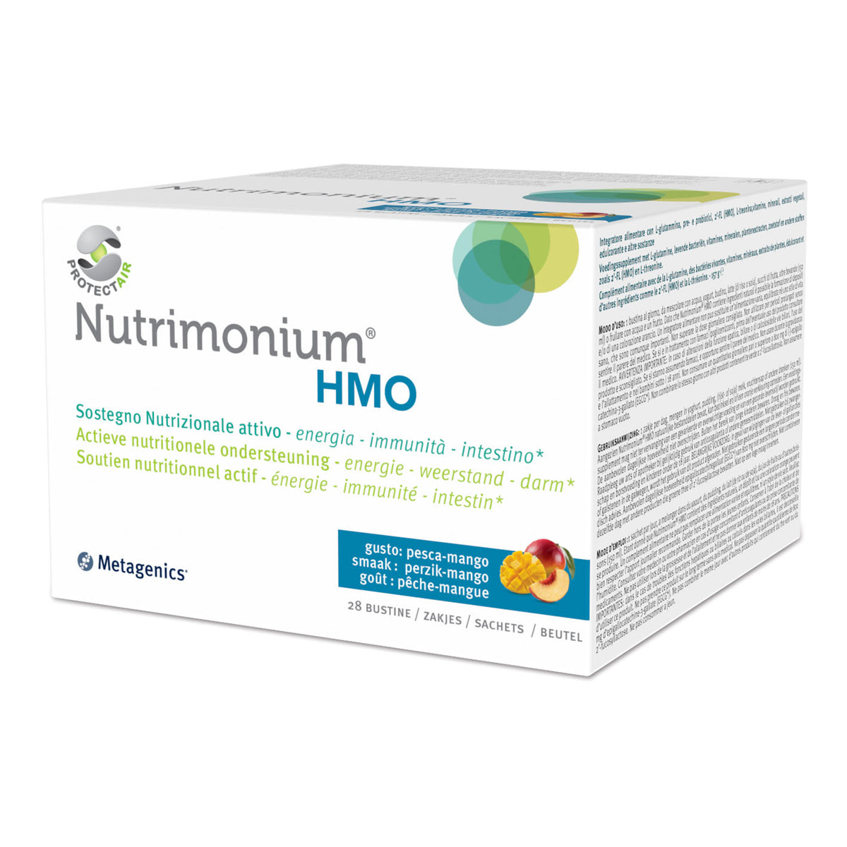 L-glutammina, bisglicinato di calcio, bisglicinato di magnesio, inulina arricchita di oligofruttosio; addensante: gomma di guar; 2'-fucosillattosio (lattosio < 2%); correttore di acidità: acido malico; aroma di pesca e mango, sale sodico dell'acido alfalipoico, cloruro di potassio, acido ascorbico, L-treonina, lactobacillus acidophilus NCFM, quercetina, dipeptide L-alanil-L-glutammina, bisglicinato di zinco, estratto secco di foglie di tè verde [Camellia sinensis (L.) Kuntze], estratto di rizoma di curcuma (Curcuma longa L.); edulcorante: glicosidi di steviolo; tocoferoli misti, niacinamide, pantotenato di calcio, betacarotene, citrato di manganese, piridossal-5-fosfato, riboflavina, cloridrato di tiamina, picolinato di cromo, L-metilfolato di calcio (Metafolin), ioduro di potassio, L-selenometionina, molibdato di sodio, biotina, metilcobalamina, colecalciferolo.