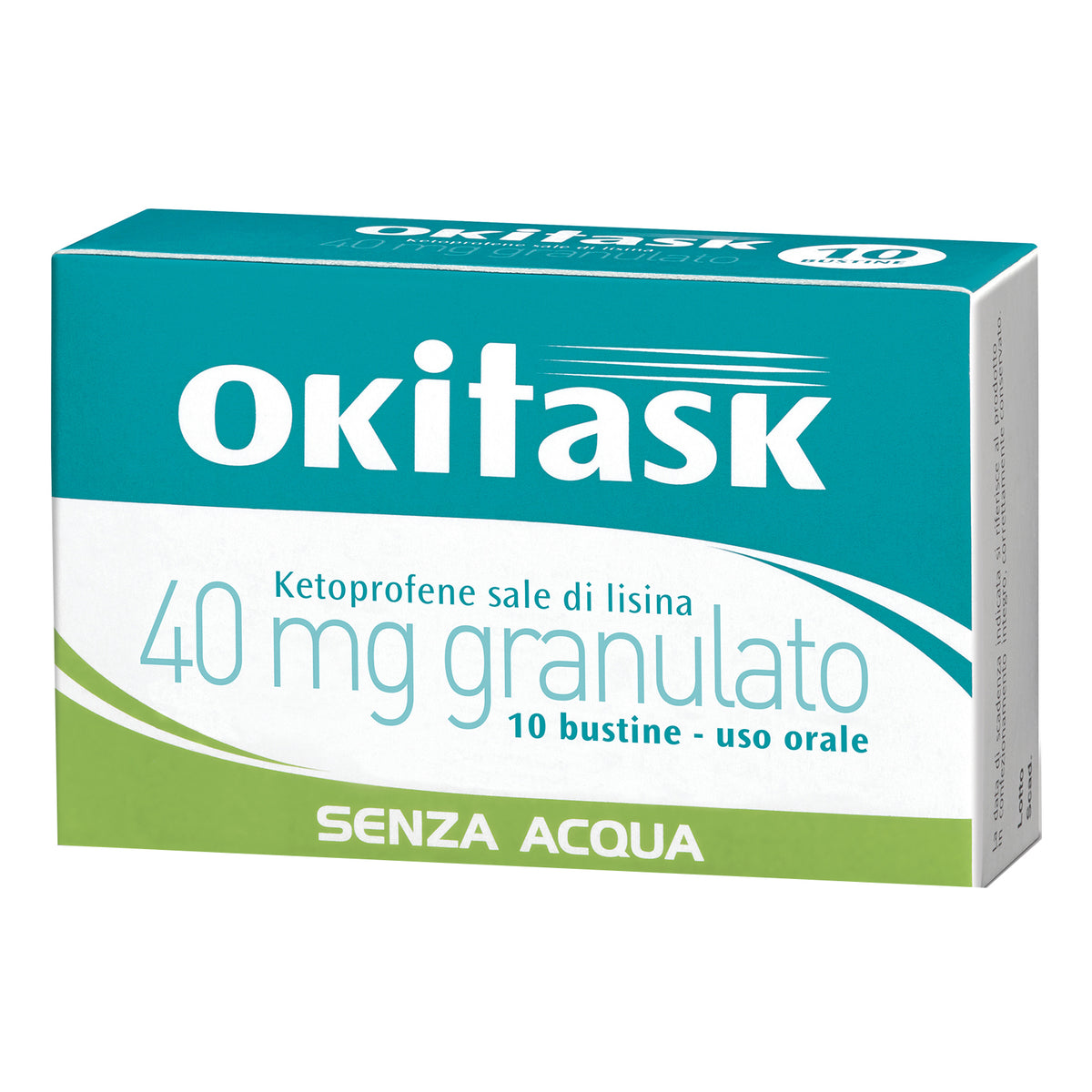 OKiTask 40mg è un farmaco OTC (da banco) a base di Ketoprofene 25mg (come sale di lisina 40mg) in bustine di granulato orosolubile, antinfiammatorio non steroideo (FANS) per il trattamento di dolori di diversa origine: mal di testa, mal di denti, nevralgie, dolori mestruali, dolori muscolari e osteoarticolari. Si scioglie in bocca senza acqua.
