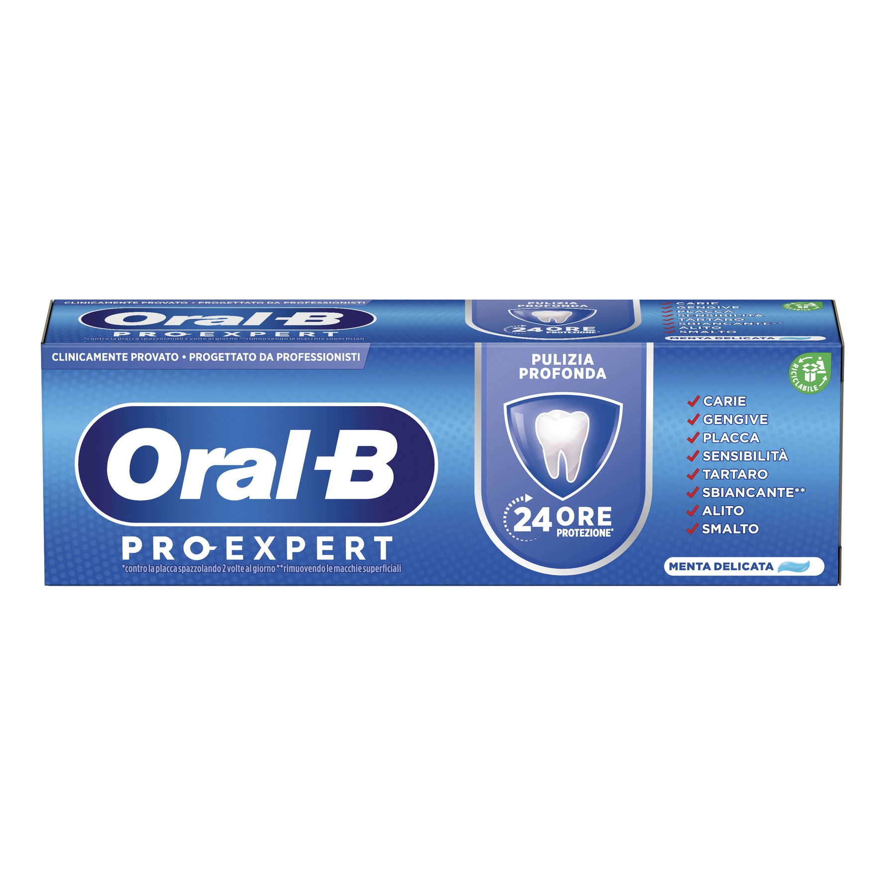 Oral-B Pro-Expert Dentifricio Protezione Professionale offre una combinazione unica di ingredienti per una protezione di 24 ore. Combatte anche la placca interdentale. Agisce sulle 8 zone più controllate dai dentisti proteggendole in modo efficace.