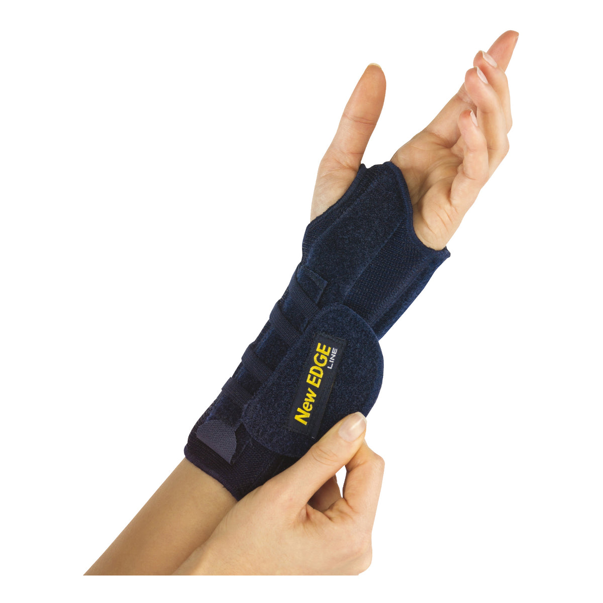 tutore di supporto, protezione ed immobilizzo del polso. Il particolare sistema di chiusura NewEdge, consente di personalizzare questo tutore secondo un'infinità di esigenze di misura e di compressione individuali. Nella base sono inserite tre aste anatomiche, modellabili a freddo ed estraibili secondo le necessità. Al fine di assicurare comfort e permettere un utilizzo prolungato nel tempo, é stata posta particolare attenzione nella selezione dei tessuti, fatti esclusivamente con fibre naturali, anallergici e traspiranti: