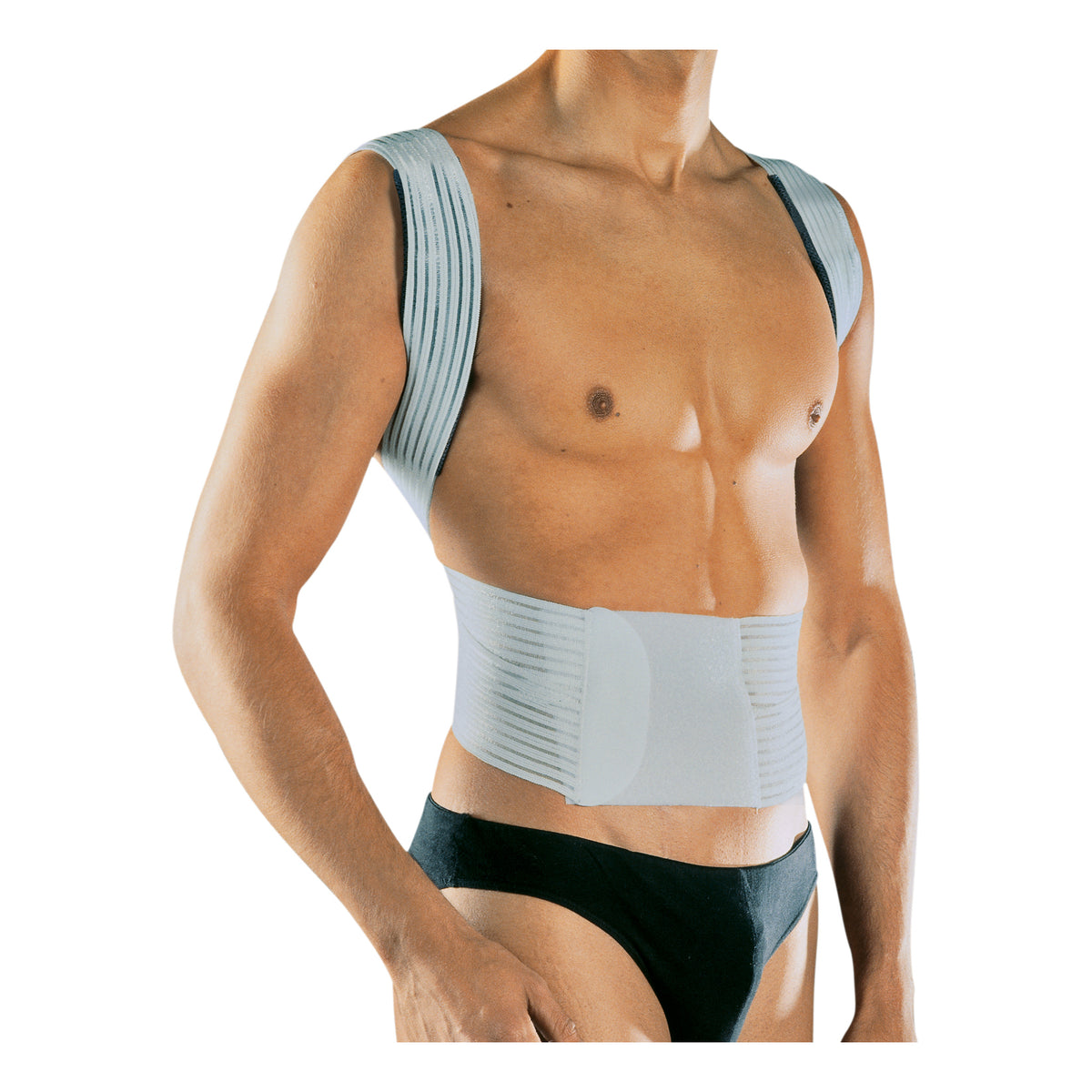 sostegno passivo, mantiene eretta la colonna evitandone l'inclinazione anteriore ed alleviando da carichi eccessivi la muscolatura cervicale. Il particolare sistema di incrocio posteriore delle due fasce, esercita un'azione di forza sulla muscolatura dorsale, la cui efficacia cresce proporzionalmente alla tensione data alla banda di chiusura a velcro posta anteriormente, sulla parete addominale. Facile da indossare e regolare. Indossato sopra una maglietta intima, garantisce il massimo comfort e puóessere indossato per tutta la giornata. Anallergico e 100% traspirante.