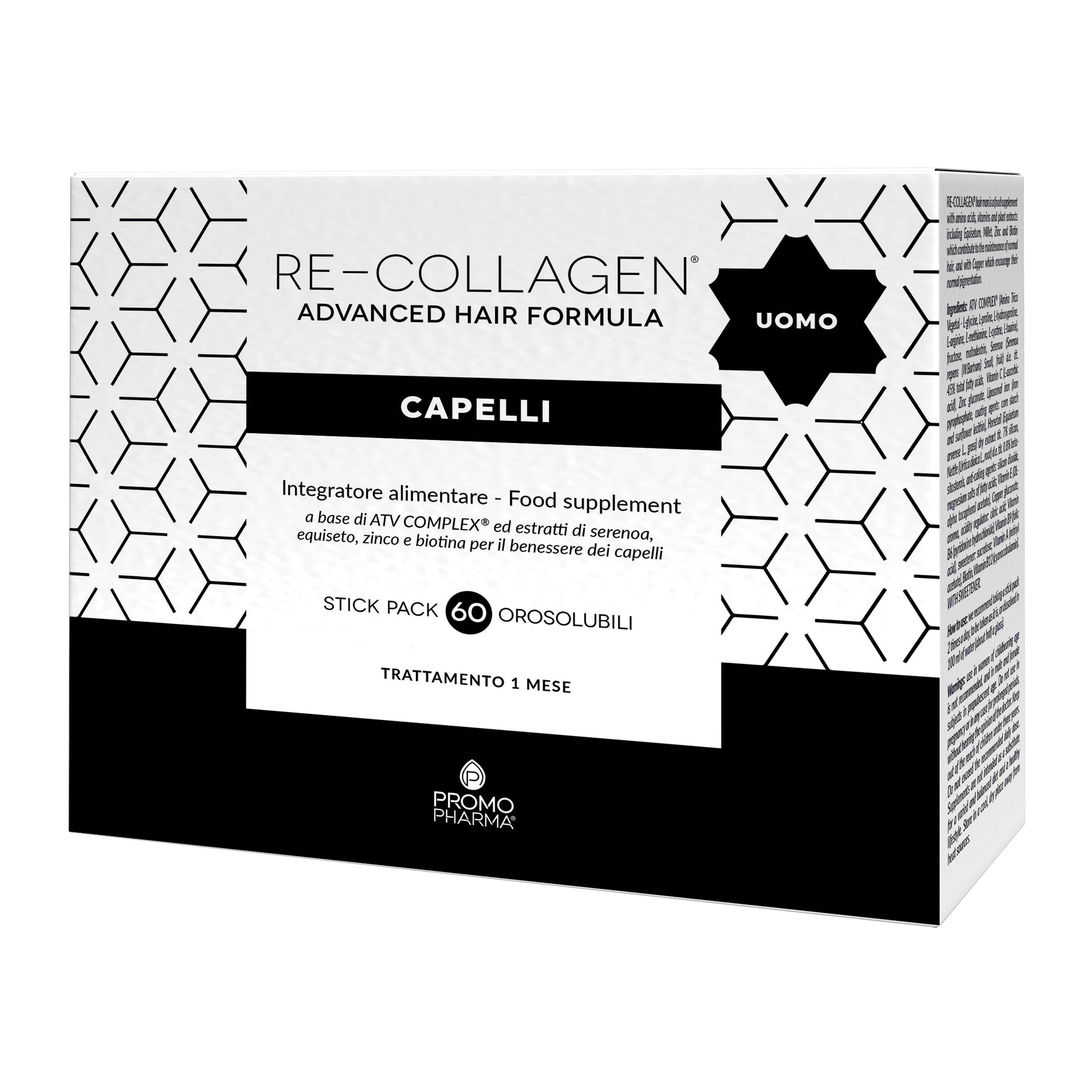 Re-Collagen capelli uomo è un integratore alimentare con aminoacidi, vitamine ed estratti vegetali come equiseto, zinco e biotina, che contribuiscono al mantenimento di capelli normali e con rame per la normale pigmentazione dei capelli.
