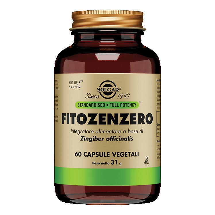 Nell'esclusiva formula FITOZENZERO Solgar l'estratto di rizoma di Zingiber officinale Rosc. standardizzato nei costituenti attivi (5% gingeroli) è associato alla naturale ricchezza del rizoma polverizzato. Contiene PhytO2XTM, un'esclusiva miscela di antiossidanti (beta-carotene e vitamina C) utile a preservare la stabilità della formula.