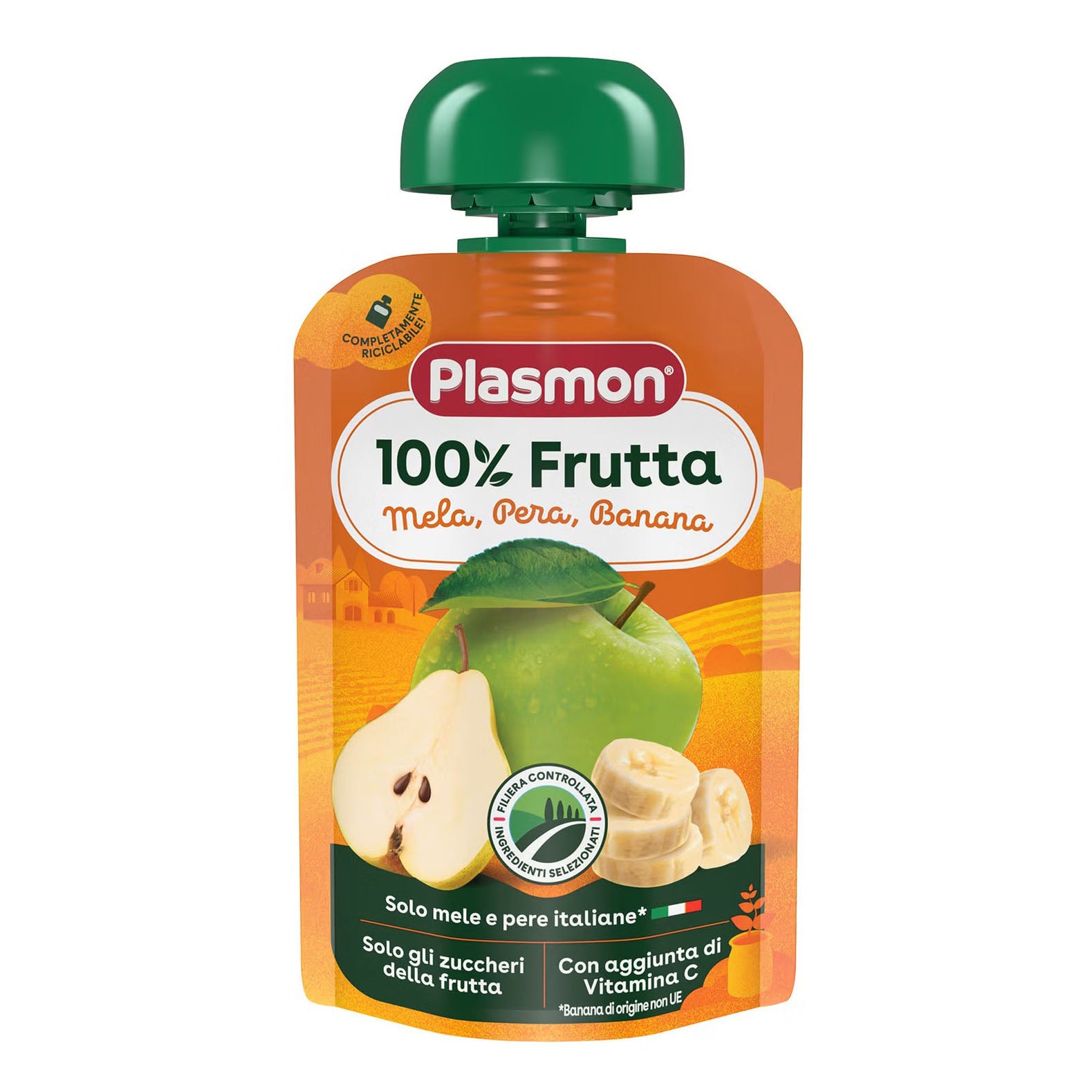 Frutta (99%); mela 53% (purea di mela, purea concentrata di mela); pera 26% (purea di pera, purea concentrata di pera); banana 20%; succo concentrato di limone; vitamina C.