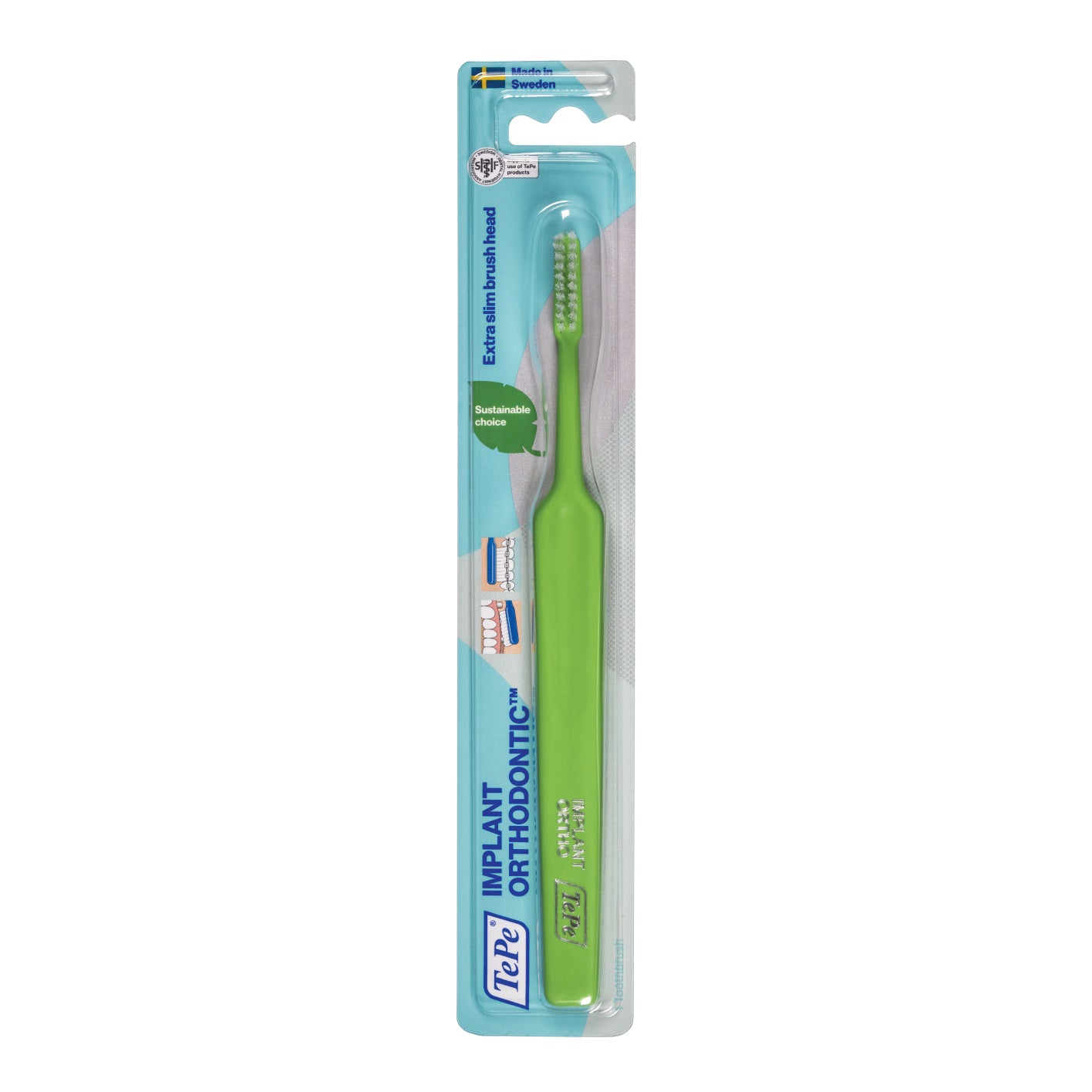 Spazzolino dai filamenti soffici disposti su due file ha una testina molto sottile e un collo lungo e affilato, che facilita l'accesso e la pulizia attorno agli impianti e ai fili ortodontici.Cod. 442300
