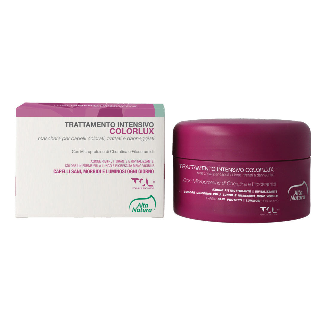 Trattamento intensivo Maschera Colorlux Trichology Lab ristruttura e rivitalizza il capello ed in sinergia con i coco-gliceridi contenuti nel burro di mango selvatico bio, dona volume e luminosità alla chioma. L'efficace combinazione del complesso esclusivo TCL di Alta Natura e delle microproteine Idrolisate di Cheratina, consente il quotidiano nutrimento del capello sottoposto a cicli di colorazione. Il complesso TCL, nuovo ritrovato di Alta Natura Trichology Lab è costituito da una equilibrata miscela di aloe vera bio ad alta concentrazione, estratto di Centella Asiatica e gomma di guar.
