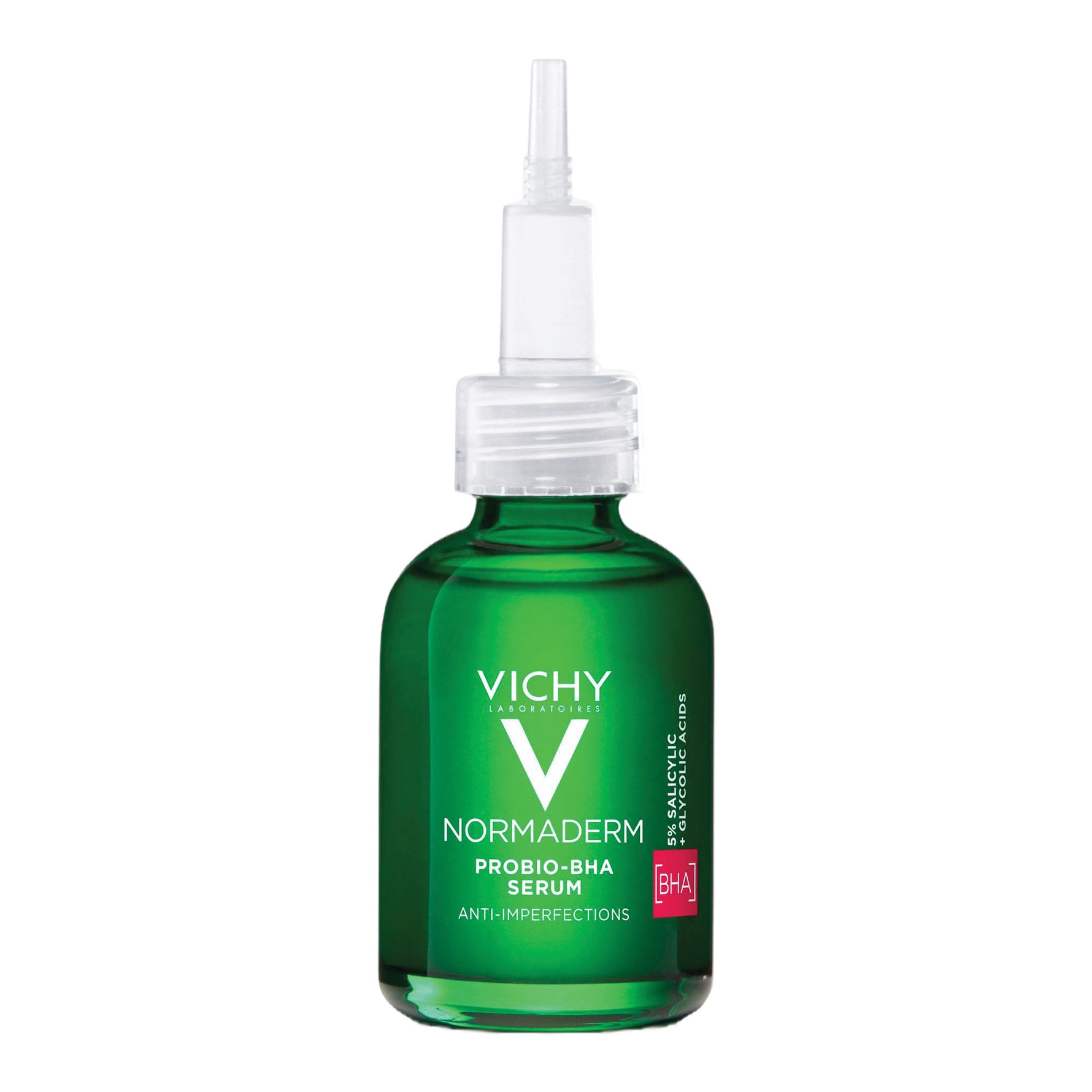 Il siero correttivo Vichy Normaderm anti-blemish è formulato con il 5% di acido salicilico e glicolico ed estratti probiotici.
