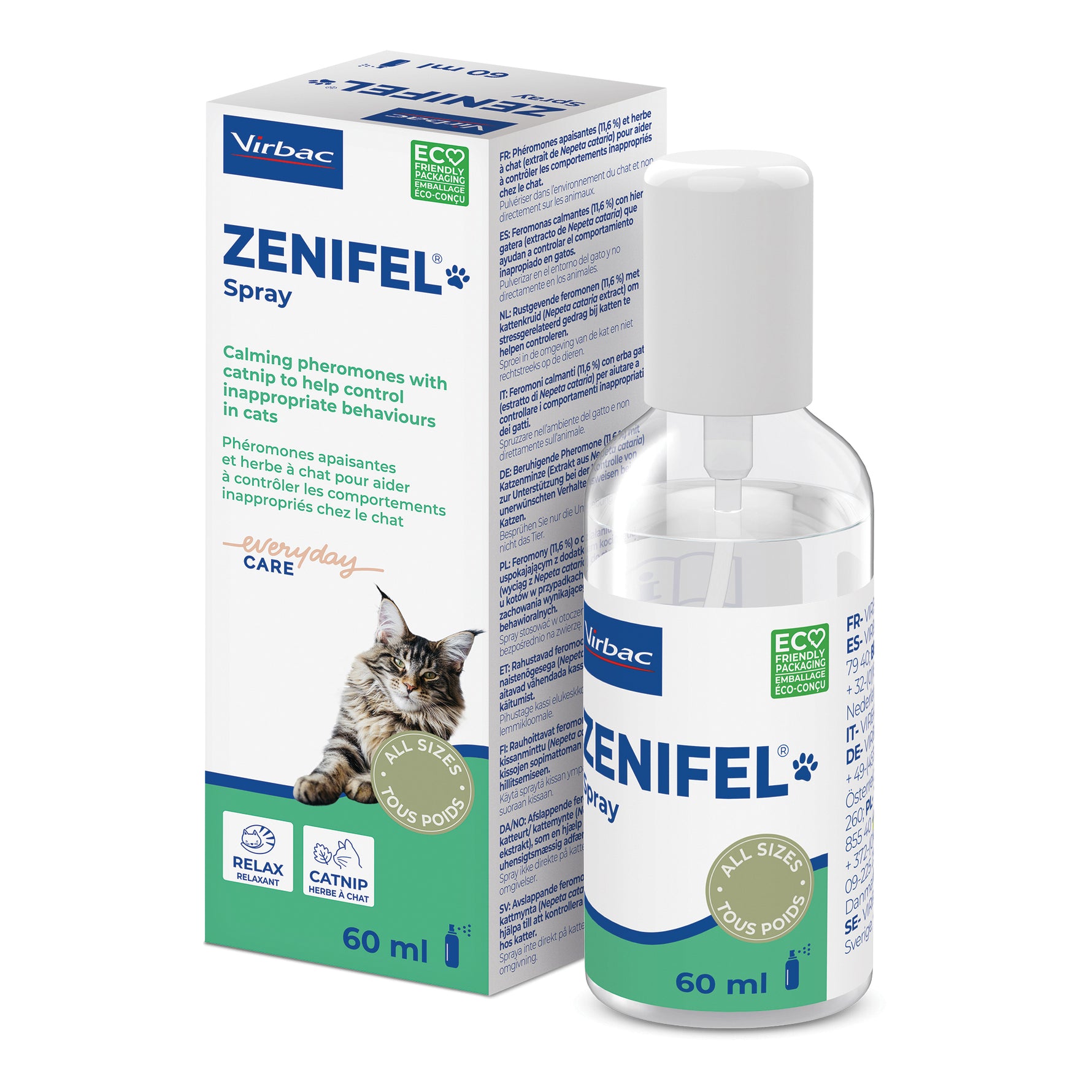 Zenifel Spray è una formula innovativa realizzata con la frazione F3 degli analoghi dei feromoni facciali felini (11,6%) e l'estratto di Nepeta cataria, comunemente chiamato erba gatta. Le fonti vegetali di estratto di Nepeta cataria sono anche note per migliorare il benessere generale dei gatti così come la marcatura facciale.