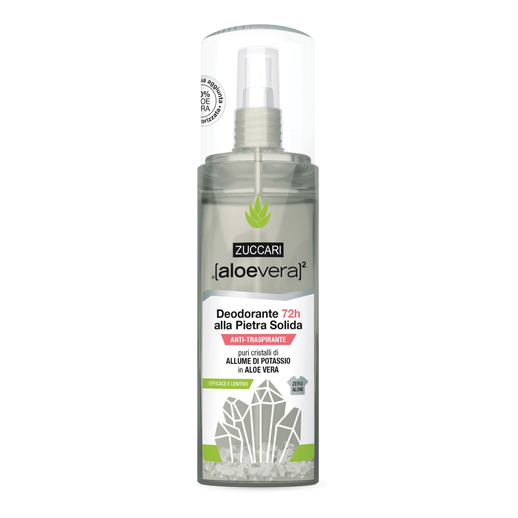 L’ingrediente che mi rende così speciale è l’Allume di Potassio, il solo anti-odorante di grande efficacia utilizzabile così come presente in natura. Nella mia formula è contenuto in cristalli solidi immersi in Aloe vera. La migrazione delle particelle dei cristalli verso la soluzione liquida assicura la massima concentrazione costante di questo minerale. Contengo Trietil citrato – una molecola “intelligente” che si attiva con il sudore combattendo i cattivi odori – Xilitolo per il controllo della crescita microbica e Alluminio cloridrato per favorire la riduzione della sudorazione grazie alla regolazione dell’attività delle ghiandole sudoripare. Per rendere più gentile l’azione dell’Alluminio cloridrato sono arricchito con Hamamelis virginiana, con azione astringente e disarrossante.